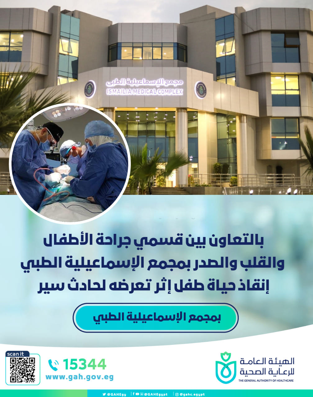بالتعاون بين قسمي جراحة الأطفال والقلب والصدر بمجمع الإسماعيلية الطبي.. إنقاذ حياة طفل إثر تعرضه لحادث سير