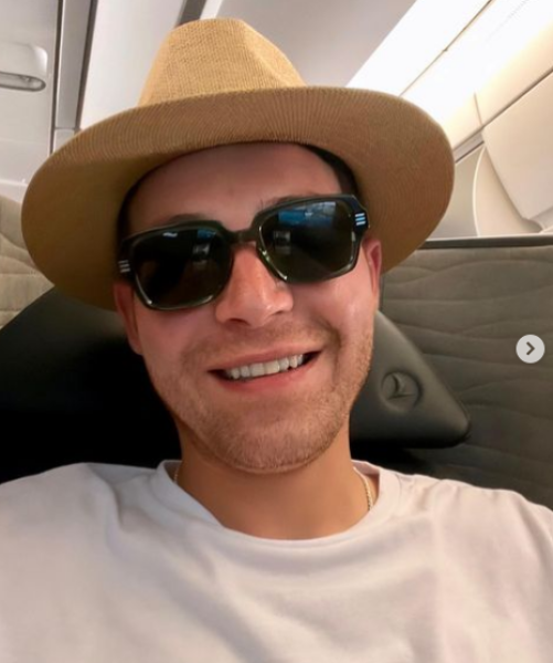 وظهر حجازي من الطائرة بلوك كاجوال، وكتب متفاعلا مع جمهوره من خلال صوره: "صباح الخير..رايح لفين؟".