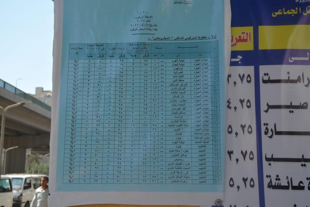 وأكد محافظ الجيزة ان التعريفات الجديدة التي تم وضعها روعي فيها الصالح العام سواء للمواطن أو السائق بحيث لا تتعدي الزيادة عن ٧% ، مشيراً إلي انه تم تكثيف الجولات الميدانية والحملات المفاجئة على مواقف السيارات بالكامل منذ اليوم الأول لإعلان الأسعار والتعريفات الجديدة وذلك للتأكد من الإلتزام بها في الخطوط الداخلية والخارجية مع التأكيد علي وضع بانرات بالتعريفة الجديدة واستيكرات علي السيارات مشدداً على عدم السماح لأي سائق بالتلاعب بالتعريفة المقررة وتطبيق القانون على كل سائق مخالف يقوم بزيادة التعريفة وأستغلال المواطنين .