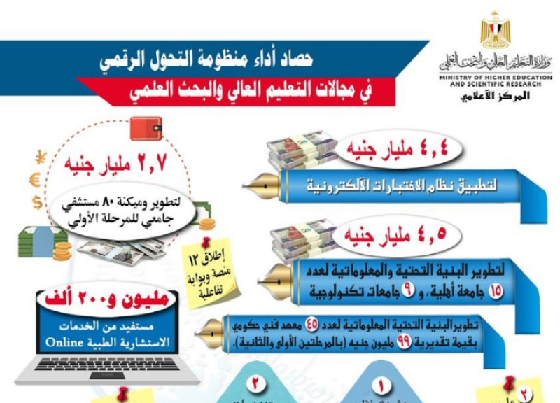 • بتكلفة تزيد عن 11 مليار جنيه تنفيذ مشروعات التحول الرقمي في مجالات التعليم العالي والبحث العلمي.
