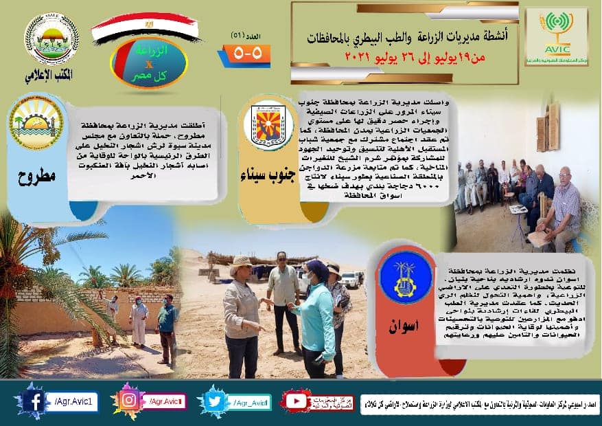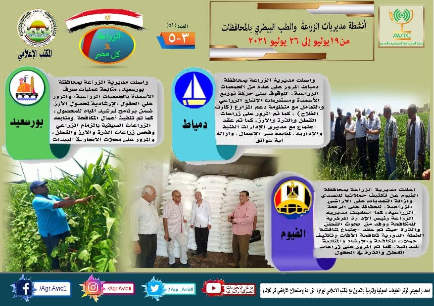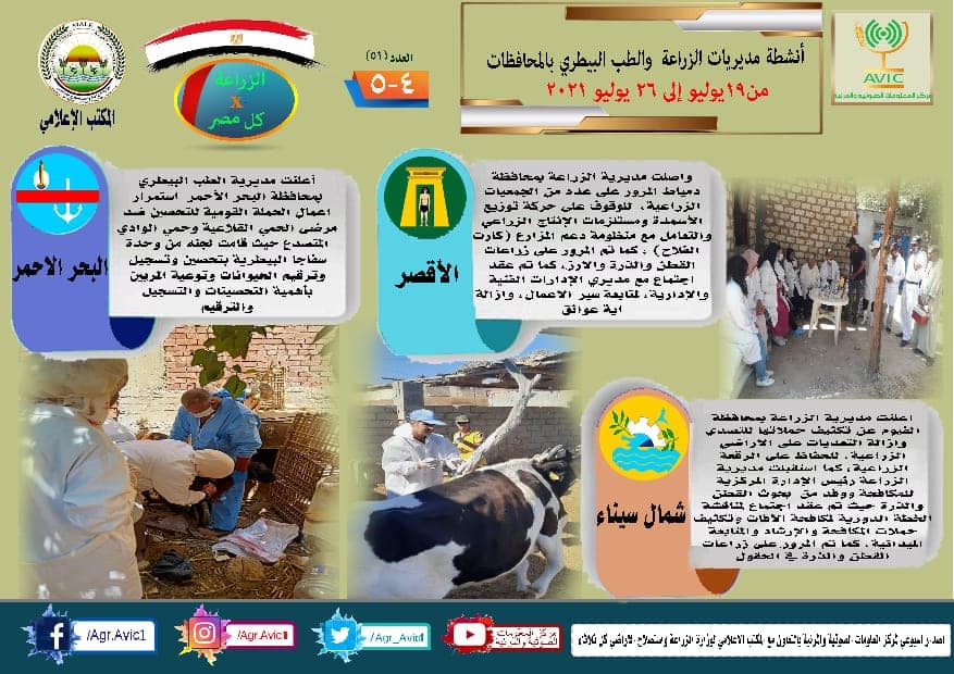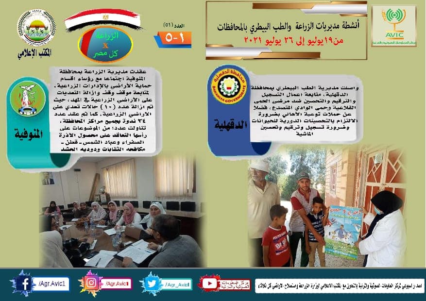أصدر مركز المعلومات الصوتية والمرئية التابع لوزارة الزراعة واستصلاح الأراضي، والمكتب الاعلامي للوزارة، العدد رقم ٥١ من اصدار: "الزراعة في كل مصر" بالانفوجراف والفيديو، يوضح الجهود والانشطة التي تقوم بها مديريات الزراعة والطب البيطري بمحافظات الجمهورية خلال الفترة من ١٩ الى ٢٦ يوليو الجاري.