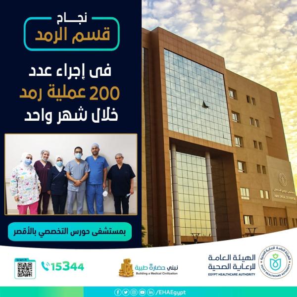 حقق قسم الرمد الرمد بمستشفي حورس التخصصي رقم قياسي للعمليات خلال شهر يونيو 2022 حيث أجريت ٢٠٠ عملية رمد من بينها عمليات إزالة المياه البيضاء والزرقاء وإزالة الظفرة بملتحمة العين تحت يد أمهر أطباء الرمد بالمستشفى.