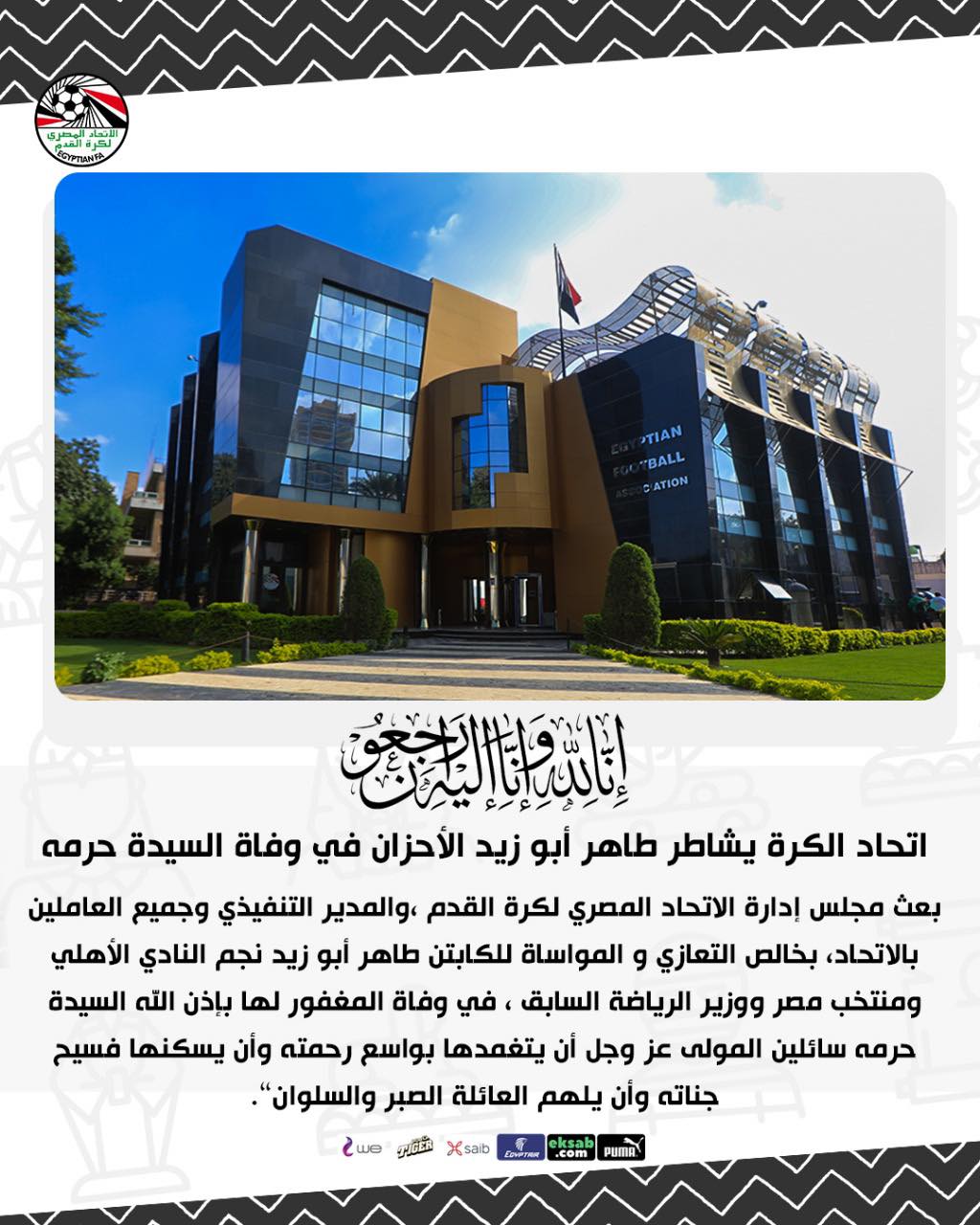 بعث مجلس إدارة الاتحاد المصري لكرة القدم ،والمدير التنفيذي وجميع العاملين بالاتحاد، بخالص التعازي و المواساة للكابتن طاهر أبو زيد نجم النادي الأهلي ومنتخب مصر ووزير الرياضة السابق ، في وفاة المغفور لها بإذن الله السيدة حرمه سائلين المولى عز وجل أن يتغمدها بواسع رحمته وأن يسكنها فسيح جناته وأن يلهم العائلة الصبر والسلوان”.