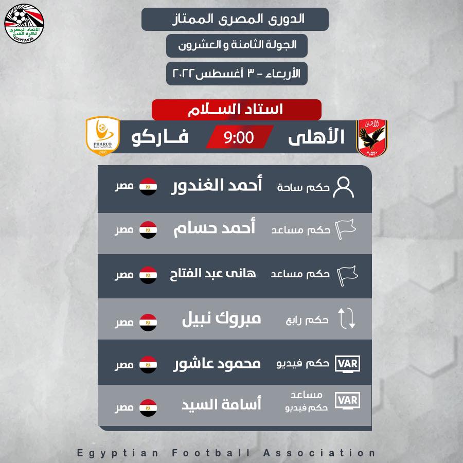 أسندت لجنة الحكام باتحاد الكرة مباراة الأهلي و فاركو إلى الحكم الدولي أحمد الغندور في اللقاء المقرر له التاسعة مساء غد الأربعاء على استاد الأهلي و السلام، ضمن منافسات الجولة الـ28 في بطولة الدوري الممتاز.