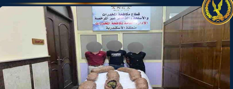 ضبط (3 أشخاص ، لهم معلومات جنائية ، وجميعهم مقيمين بدائرة مركز شرطة المنزلة بالدقهلية) حال إستقلالهم إحدى السيارات بدائرة قسم شرطة الدخيلة بالإسكندرية ، وبحوزتهم (كمية من مخدر البانجو وزنت 20 كيلو جرام – مبلغ مالى – 3 هواتف محمولة).