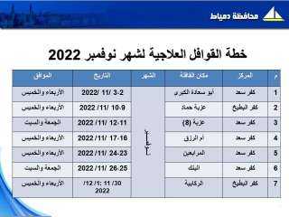 أما بمركز فارسكور فمن المقرر أن تعقد قافلة بقرية كرم ورزوق يومي الأربعاء والخميس الموافقين ( 24، 25 أغسطس)، على أن تُختتم فاعليات القوافل لهذا الشهر بقرية النوادرية بذات المركز يومي الجمعة والسبت (26، 27 أغسطس).