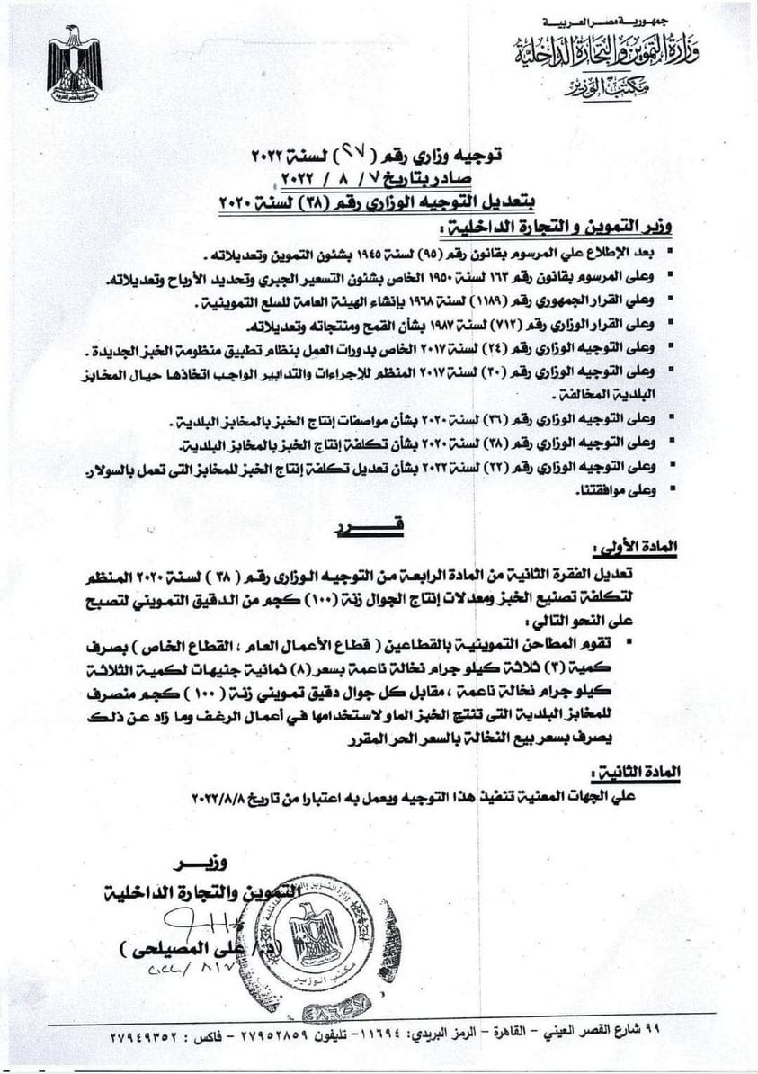 أصدر الدكتور على المصيلحى وزيرالتموين والتجارة الداخلية، توجيه وزاري جديد حمل رقم رقم ( ٢٧) لسنة ٢٠٢٢، بتعديل بعض بنود التوجيه الوزاري رقم (۳۸) لسنة ٢٠٢٠، والخاص بتكلفة تصنيع الخبزالمدعم ومعدلات إنتاج جوال الدقيق.