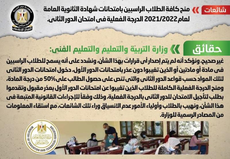 تداولت بعض المواقع الإلكترونية وصفحات التواصل الاجتماعي أنباء بشأن منح كافة الطلاب الراسبين بامتحانات شهادة الثانوية العامة لعام 2021/2022 الدرجة الفعلية في امتحان الدور الثاني، وقد قام المركز الإعلامي لمجلس الوزراء بالتواصل مع وزارة التربية والتعليم والتعليم الفني، والتي نفت تلك الأنباء، مُؤكدةً أنه لا صحة لمنح كافة الطلاب الراسبين بامتحانات شهادة الثانوية العامة لعام 2021/2022 الدرجة الفعلية في امتحان الدور الثاني، وأنه لم يتم إصدار أي قرارات بهذا الشأن، مُشددةً على أنه يسمح للطلاب الراسبين في مادة أو مادتين أو الذين تغيبوا دون عذر بامتحانات الدور الأول، دخول امتحانات الدور الثاني لتلك المواد حسب قواعد الدور الثاني والتي تنص على حصول الطالب على 50% من درجة المادة، ومنح الدرجة الفعلية الكاملة للطلاب الذين تغيبوا عن امتحانات الدور الأول بعذر مقبول وتقدموا بطلب لتأجيل الامتحان للدور الثاني بالدرجة الفعلية، وذلك وفقاً للإجراءات القانونية المتبعة في هذا الشأن، مُهيبة بالطلاب وأولياء الأمور عدم الانسياق وراء تلك الشائعات، مع استقاء المعلومات من المصادر الرسمية للوزارة.