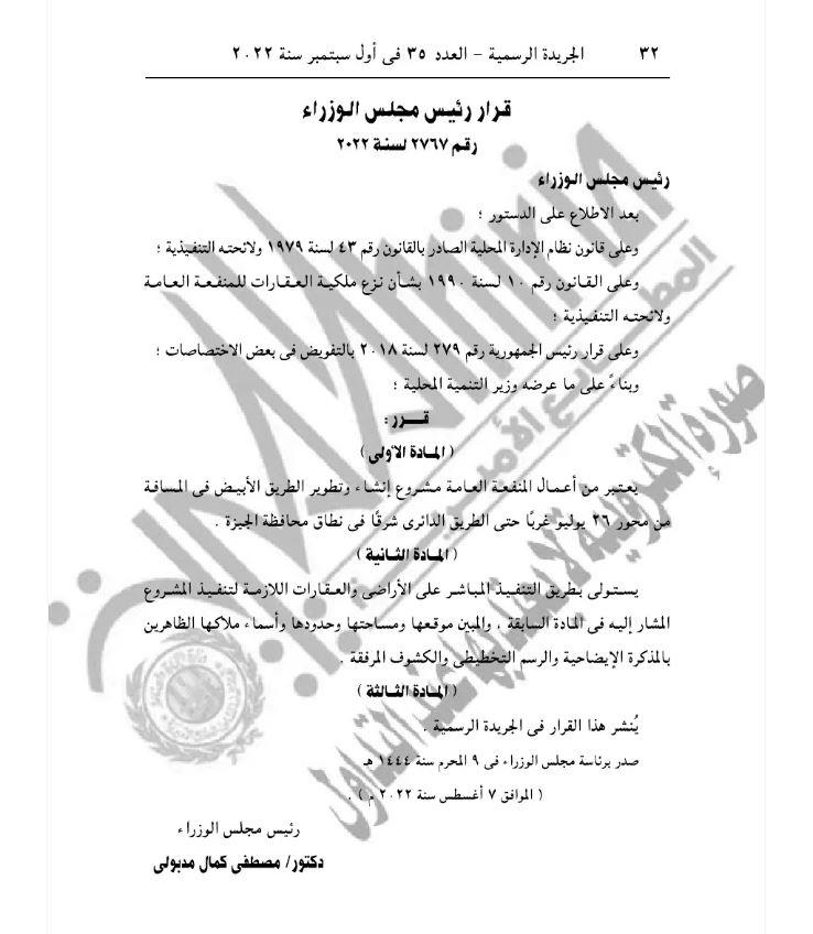 نشرت الجريدة الرسمية، اليوم الخميس، قرار رئيس الوزراء رقم 2767 لسنة 2022 بشأن اعتبار مشروع انشاء وتطوير الطريق الأبيض في المسافة من محور 26 يوليو غربًا حتى الطريق الدائري شرقا في نطاق محافظة الجيزة من أعمال المنفعة العامة.