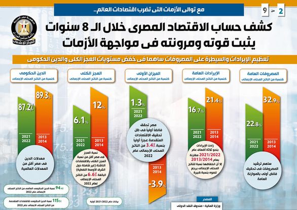 وألمح التقرير إلى أن تعظيم الإيرادات والسيطرة على المصروفات ساهما في خفض مستويات العجز الكلي والدين الحكومي، ففيما يتعلق بالمصروفات العامة كنسبة من الناتج المحلي الإجمالي، فقد بلغت 22.8% عام 2021/2022، مقابل 32.9% عام 2013/2014. وقد ساهم ترشيد المصروفات في تحقيق فائض أولي بالموازنة العامة.