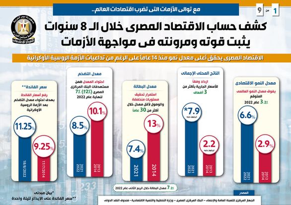 ولفت التقرير إلى احتواء معدل التضخم ضمن مستهدفات البنك المركزي المصري 7% (±2%) لنهاية عام 2022، حيث سجل 8.5% عام 2021/2022، مقابل 10.1% عام 2013/2014، في حين شهدت أسعار الفائدة على الإيداع لليلة واحدة ارتفاعاً بهدف احتواء معدل التضخم بعد الأزمة الروسية الأوكرانية، لتسجل 11.25% في 18/8/2022، مقابل 9.25% في 17/7/2014.
