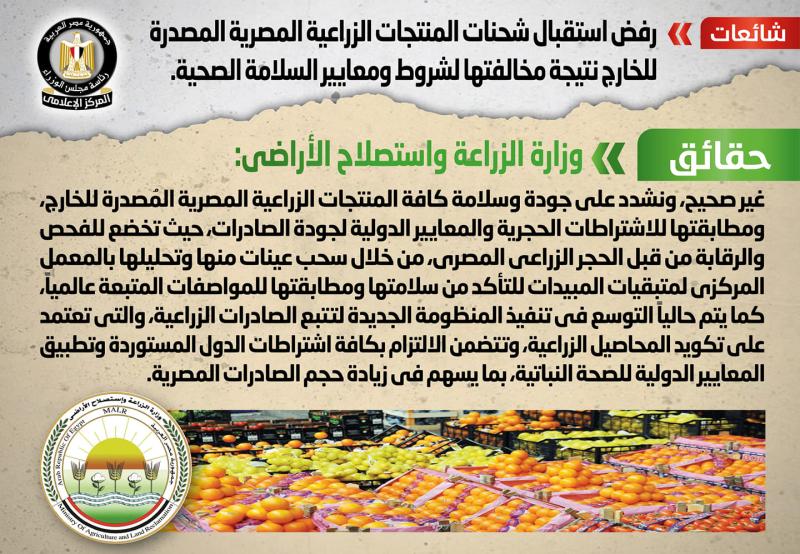 انتشر في بعض المواقع الإلكترونية وصفحات التواصل الاجتماعي أنباء بشأن رفض استقبال شحنات المنتجات الزراعية المصرية المصدرة للخارج نتيجة مخالفتها لشروط ومعايير السلامة الصحية، وقد قام المركز الإعلامي لمجلس الوزراء بالتواصل مع وزارة الزراعة واستصلاح الأراضي، والتي نفت تلك الأنباء، مُؤكدةً أنه لا صحة لرفض استقبال شحنات المنتجات الزراعية المصرية المصدرة للخارج نتيجة مخالفتها لشروط ومعايير السلامة الصحية، مُشددةً على جودة وسلامة كافة المنتجات الزراعية المصرية المُصدرة للخارج، ومطابقتها للاشتراطات الحجرية والمعايير الدولية لجودة الصادرات، حيث تخضع للفحص والرقابة من قبل الحجر الزراعي المصري، من خلال سحب عينات منها وتحليلها بالمعمل المركزي لمتبقيات المبيدات للتأكد من سلامتها ومطابقتها للمواصفات المتبعة عالمياً، كما يتم حالياً التوسع في تنفيذ المنظومة الجديدة لتتبع الصادرات الزراعية، والتي تعتمد على تكويد المحاصيل الزراعية، وتتضمن الالتزام بكافة اشتراطات الدول المستوردة وتطبيق المعايير الدولية للصحة النباتية، بما يسهم في زيادة حجم الصادرات المصرية.