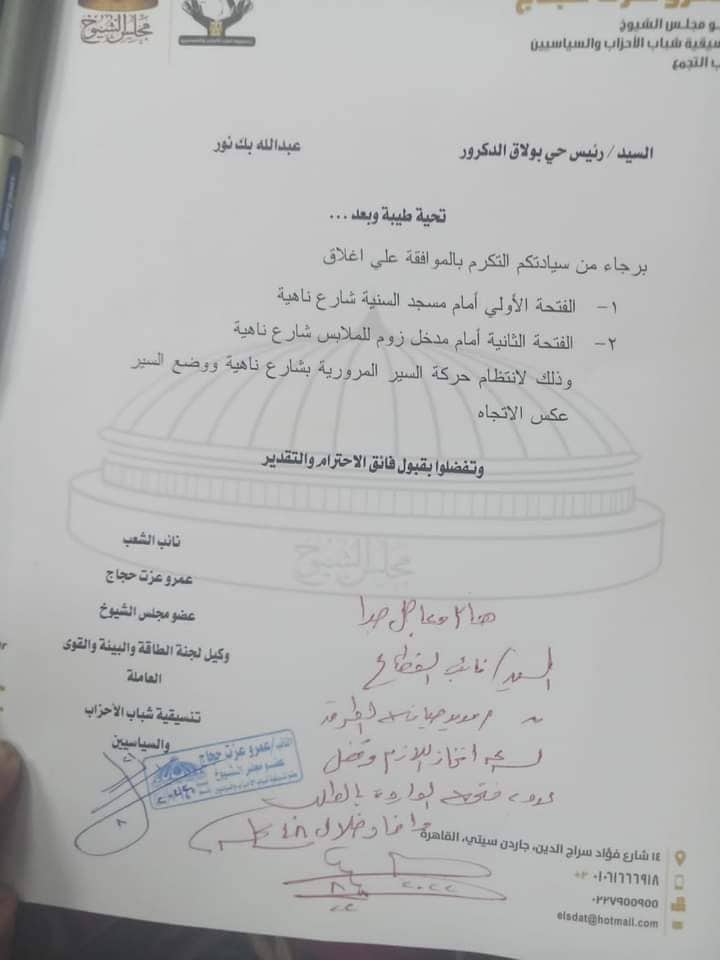 عضو مجلس الشيوخ ببولاق الدكرور يوجه الشكر لحى بولاق لسد الفتحات المخالفة بالشارع واعادة الانضباط
