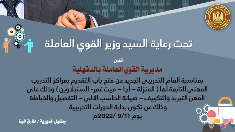 تلقت وزارة القوى العاملة تقريراً من مديرية القوى العاملة بالدقهلية ، بشأن الإعلان عن فرصة للتدريب المهنى على 3 مهن يحتاجها سوق العمل ، وذلك بمركز التدريب المهنى بالمنزلة والسنبلاوين واجا وميت غمر.