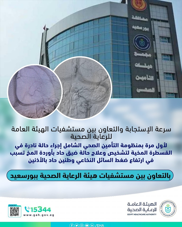 لأول مرة اجراء حالة نادرة في القسطرة المخية بمستشفيات التأمين الصحى الشامل ببورسعيد