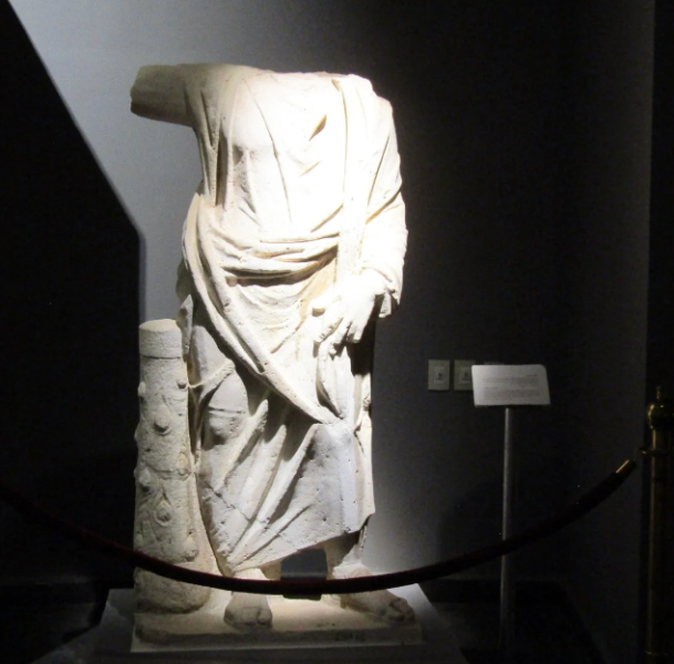 يعرض تمثال للمعبود سيرابيس على هيئة الفيلسوف فاقد الرأس.