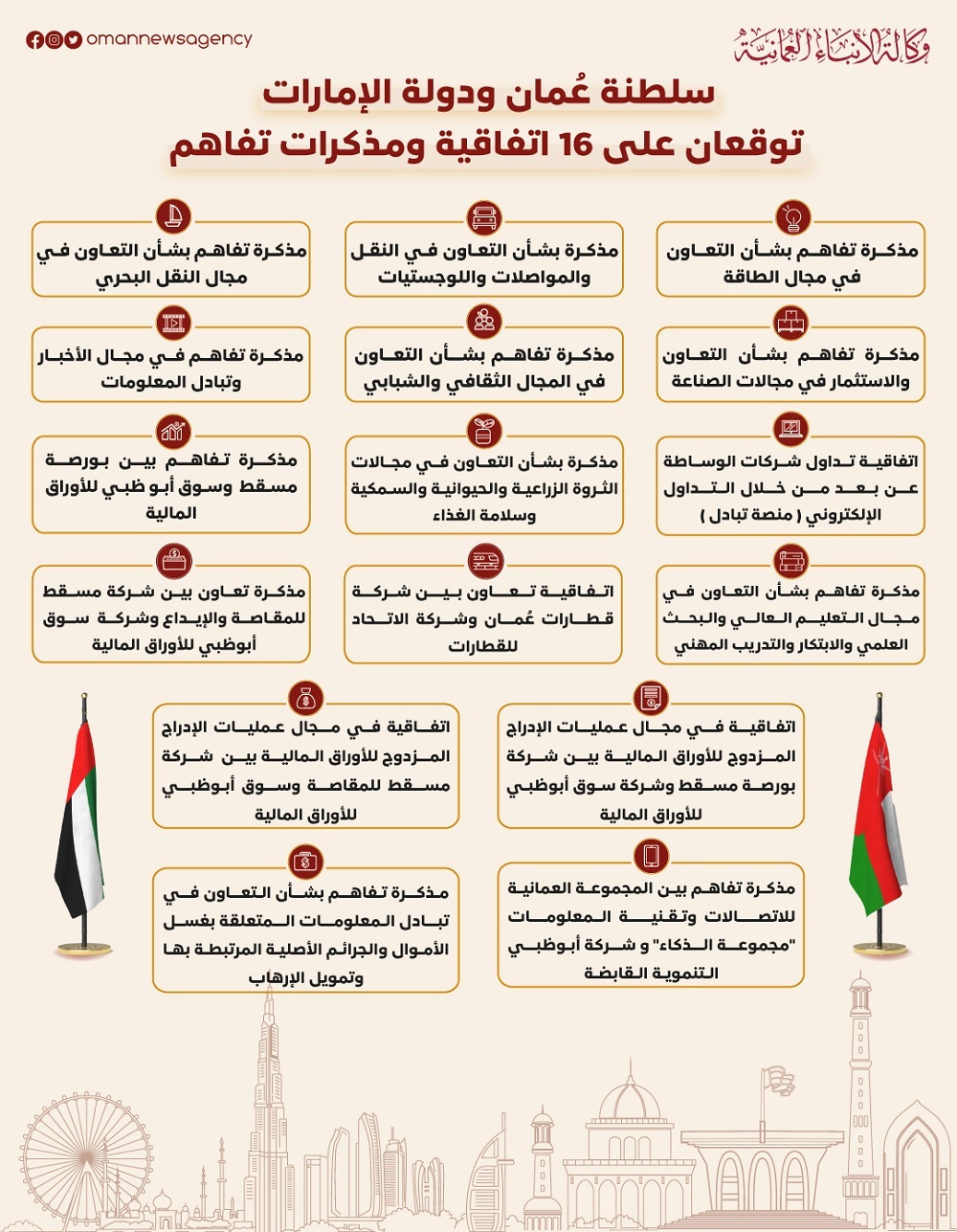 وشملت الاتفاقيات التعاون بين شركة قطارات عُمان وشركة الاتحاد للقطارات، وبين المجموعة العمانية للاتصالات وتقنية المعلومات “مجموعة الذكاء”، وبورصة مسقط وسوق أبوظبي للأوراق المالية، وتداول شركات الوساطة عن بعد من خلال التداول الإلكتروني (منصة تبادل)،