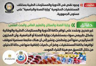 تداولت بعض المواقع الإلكترونية وصفحات التواصل الاجتماعي أنباء بشأن وجود نقص في أدوية الأورام بمختلف المستشفيات الحكومية على مستوى الجمهورية، وقد قام المركز الإعلامي لمجلس الوزراء بالتواصل مع الهيئة المصرية للشراء الموحد والإمداد والتموين الطبي وإدارة التكنولوجيا الطبية، والتي نفت تلك الأنباء، مُؤكدةً أنه لا صحة لوجود نقص في أدوية الأورام بمختلف المستشفيات الحكومية على مستوى الجمهورية، مُشددةً على توافر كافة الأدوية بشكل طبيعي بما فيها المستحضرات المدرجة ضمن بروتوكولات علاج الأورام والمستلزمات الطبية الخاصة بمرضى الأورام، دون وجود أي نقص فيها، وأن المخزون الاستراتيجي منها آمن ومُطمئن، مؤكدةً أن هناك متابعة مستمرة لموقف توافرها بكافة المستشفيات التي تقدم خدمات علاج الأورام، مع ضخ أي كميات إضافية منها بشكل فوري في حالة الاحتياج، مشيرةً إلى اتجاه الدولة نحو توطين صناعة المستحضرات الحيوية، وأدوية الأورام محلياً.