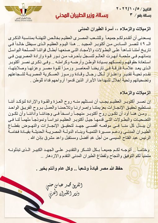 تهنية الفريق محمد عباس حلمى وزير الطيران المدني بمناسبة الذكرى الـ49 لإنتصارات الكتوبر المجيدة
