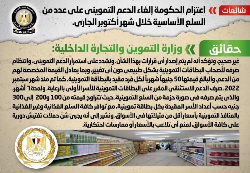 الحكومة تنفى اعتزام الحكومة إلغاء الدعم التمويني على عدد من السلع الأساسية خلال شهر أكتوبر الجاري