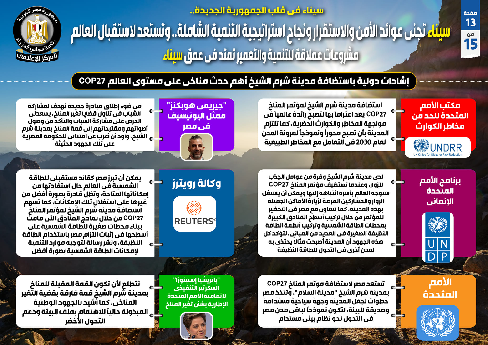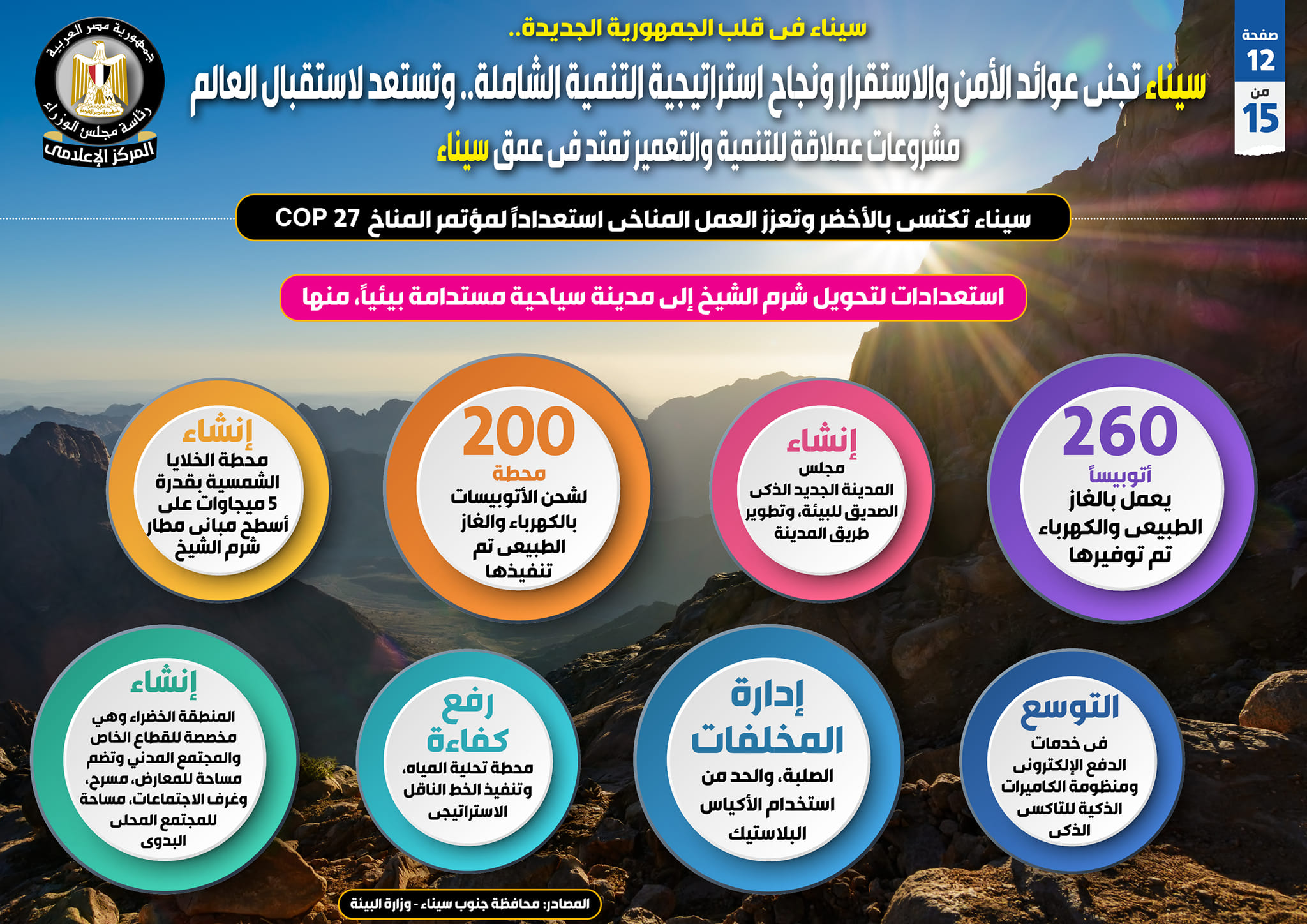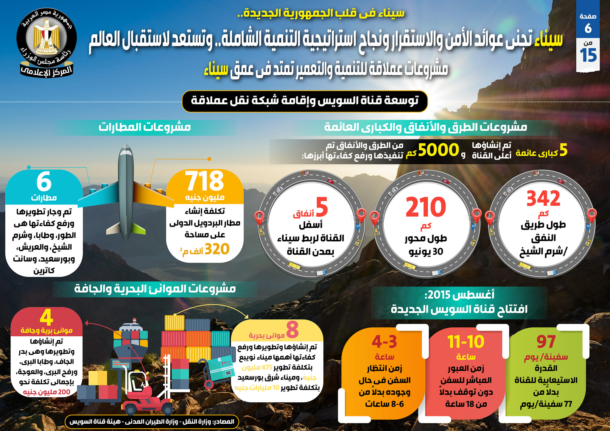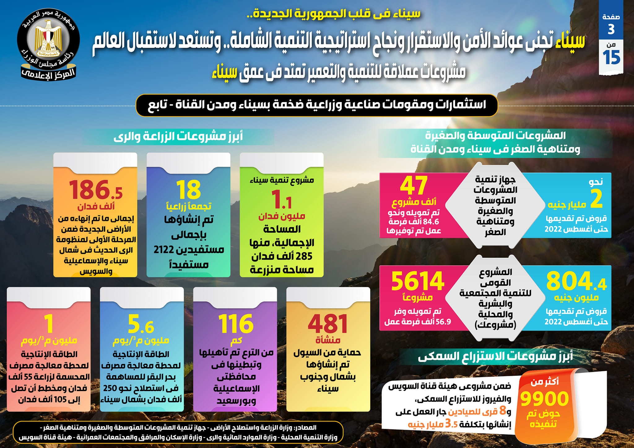 وفي هذا الصدد نشر المركز الإعلامي لمجلس الوزراء تقريراً تضمن إنفوجرافات تسلط الضوء على المشروعات العملاقة للتنمية والتعمير الممتدة في عمق سيناء التي تظل في قلب الجمهورية الجديدة، لتجني بذلك عوائد الأمن والاستقرار ونجاح استراتيجية التنمية الشاملة، وذلك في وقت تستعد فيه لاستقبال العالم.