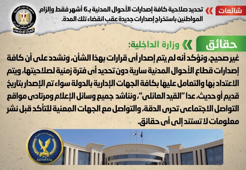 تداولت بعض المواقع الإلكترونية وصفحات التواصل الاجتماعي أنباء بشأن تحديد صلاحية كافة إصدارات الأحوال المدنية بـ6 أشهر فقط وإلزام المواطنين باستخراج إصدارات جديدة عقب انقضاء تلك المدة، وقد قام المركز الإعلامي لمجلس الوزراء بالتواصل مع وزارة الداخلية، والتي نفت تلك الأنباء، مُؤكدةً أنه لا صحة لتحديد مدة صلاحية لكافة إصدارات الأحوال المدنية أو إلزام المواطنين باستخراج إصدارات جديدة عقب انقضاء تلك المدة، وأنه لم يتم إصدار أي قرارات بهذا الشأن، مُشددةً على أن كافة إصدارات قطاع الأحوال المدنية سارية دون تحديد أي فترة زمنية لصلاحيتها، ويتم الاعتداد بها والتعامل عليها بكافة الجهات الإدارية بالدولة سواء تم الإصدار بتاريخ قديم أو حديث، عدا "القيد العائلي"، مُناشدةً جميع وسائل الإعلام ومرتادي مواقع التواصل الاجتماعي تحري الدقة، والتواصل مع الجهات المعنية للتأكد قبل نشر معلومات لا تستند إلى أي حقائق.