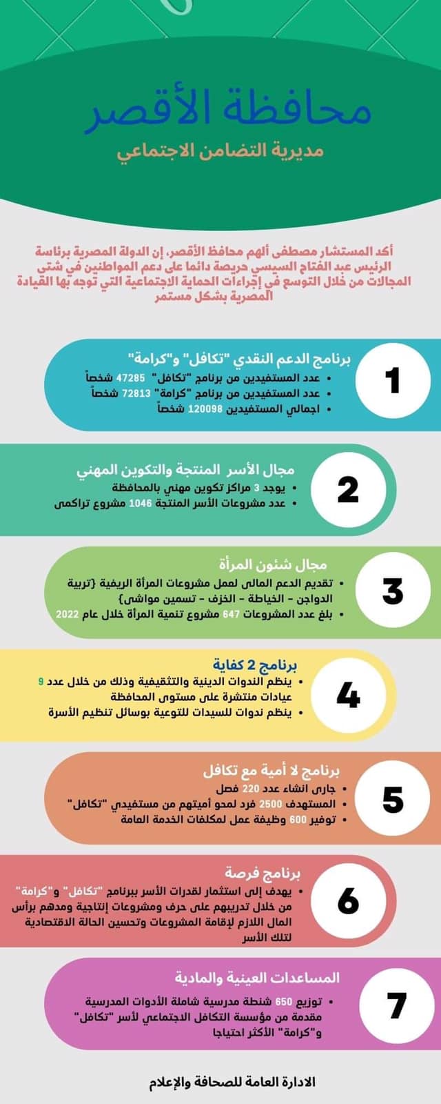 ومن جانبه، أوضح محمد حسين بغدادي مدير مديرية التضامن الاجتماعي بمحافظة الأقصر، أنه في مجال الضمان الاجتماعي وبرنامج الدعم النقدى "تكافل وكرامة" :-
