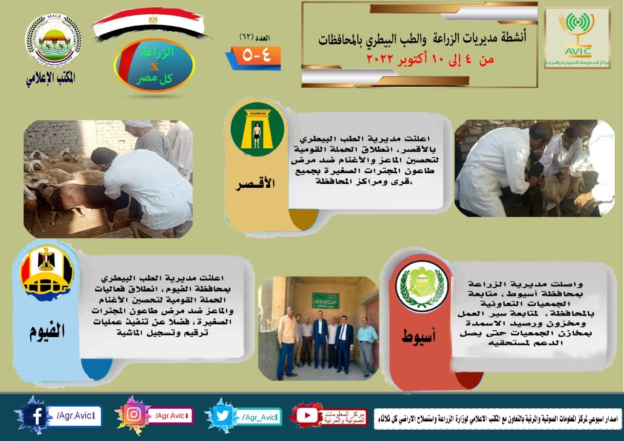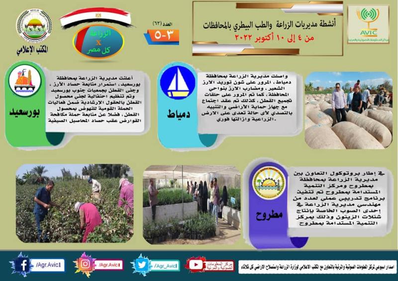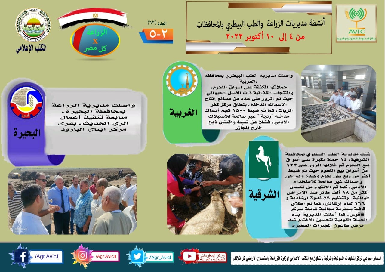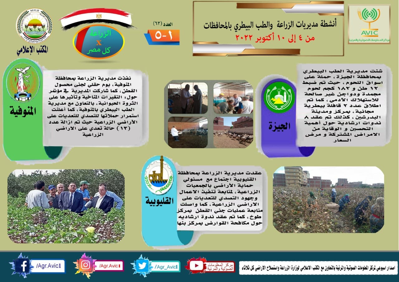 أصدر مركز المعلومات الصوتية والمرئية التابع لوزارة الزراعة واستصلاح الأراضي، والمكتب الاعلامي للوزارة، العدد رقم ٦٢ من اصدار: "الزراعة في كل مصر" بالانفوجراف والفيديو، يوضح الجهود والانشطة التي تقوم بها مديريات الزراعة والطب البيطري بمحافظات الجمهورية خلال الفترة من ٤ وحتى ١٠ اكتوبر الجاري.