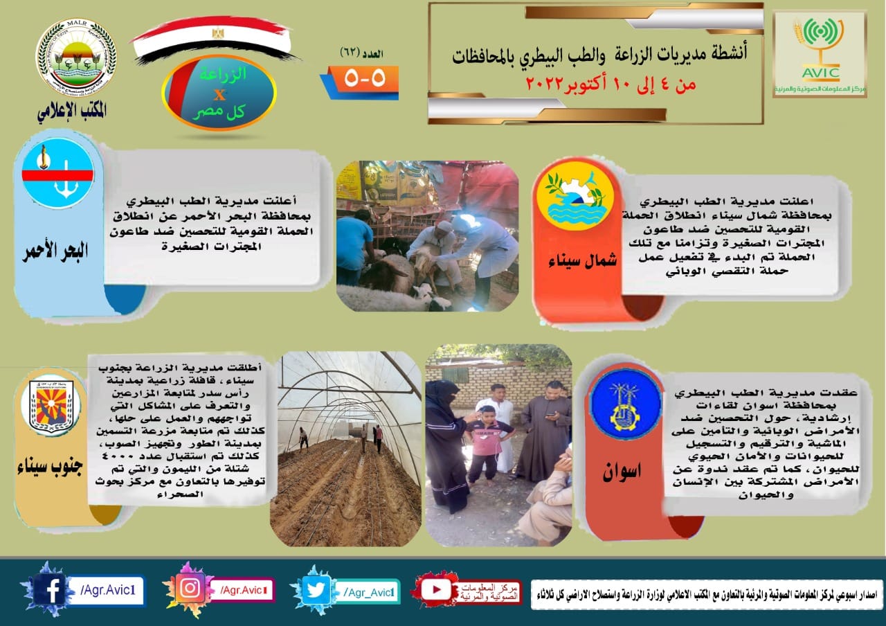 كما اعلنت مديرية الطب البيطري بمحافظة شمال سيناء انطلاق الحملة القومية للتحصين ضد طاعون المجترات الصغيرة وتزامنا مع تلك الحملة تم البدء في تفعيل عمل حملة التقصي الوبائي، كما أطلقت مديرية الزراعة بجنوب سيناء، قافلة زراعية بمدينة رأس سدر لمتابعة المزارعين والتعرف على المشاكل التي تواجههم والعمل على حلها، كذلك تم متابعة مزرعة التسمين بمدينة الطور وتجهيز الصوب، كذلك تم استقبال عدد ٤٠٠٠ شتلة من الليمون والتي تم توفيرها بالتعاون مع مركز بحوث الصحراء، كذلك عقدت مديرية الطب البيطري بمحافظة اسوان لقاءات إرشادية، حول التحصين ضد الأمراض الوبائية والتأمين على الماشية والترقيم والتسجيل للحيوانات والأمان الحيوي للحيوان، كما تم عقد ندوة عن الأمراض المشتركة بين الإنسان والحيوان.