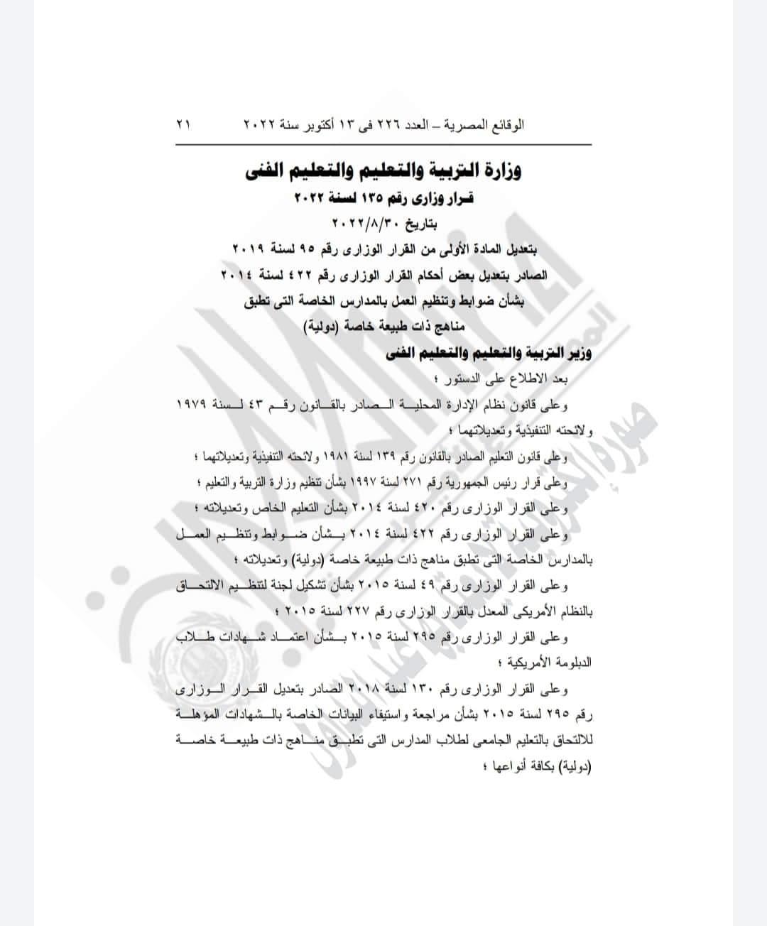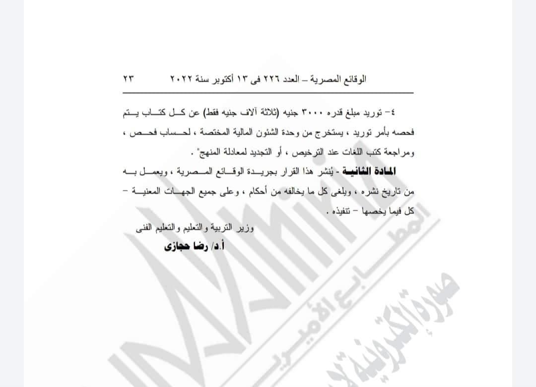 نشرت الجريدة الرسمية قرار الدكتور رضا حجازي وزير التربية والتعليم والتعليم الفني، والذي نص على أنه يستبدل بنص المادة الأولى من القرار الوزاري رقم 95 لسنة 2019 الصادر بتعديل بعض أحكام القرار الوزاري رقم 422 لسنة 2024 ما يلى.