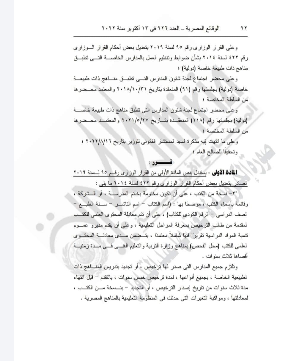 -وتلتزم جميع المدارس التى صدر لها ترخيص ، أو تجديد بتدريس المنـاهج ذات الطبيعية الخاصة، بجميع أنواعها ، لمدة ترخيص خمس سنوات ، بالتقدم قبل انتهاء مدة ثلاث سنوات من تاريخ إصدار الترخيص، أو التجديد - بنـسخة مـن الكتـب لمعادلتها، ومواكبة التغيرات التى حدثت فى المنظومة التعليمية بالمناهج المصرية.