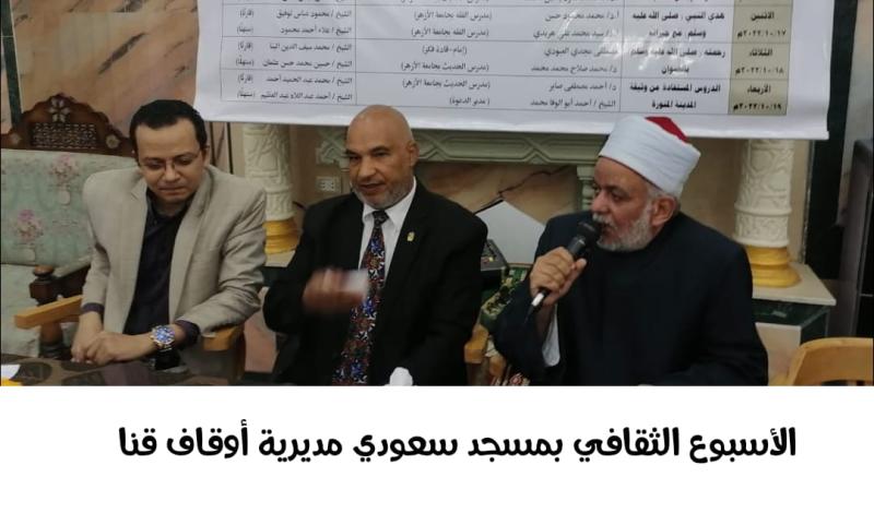 وفي مديرية أوقاف قنا أقيم الأسبوع الثقافي بمسجد سعودي، حاضر فيه أ.د/ رمضان صالحين أحمد عميد مركز التأهيل التربوي بجامعة الأزهر، والشيخ/ أحمد أبو الوفا مدير الدعوة، وقدم له الأستاذ/ أحمد فتحي الخولي المذيع بإذاعة جنوب الصعيد، والقارئ الشيخ/ أشرف الهوي قارئًا، والمبتهل الشيخ/ محمد سيف الدين البنا مبتهلًا، بحضور الشيخ/ عبدالله حارس مسئول الإرشاد الديني بالمديرية، والشيخ/ أحمد عبد الحافظ مسئول المساجد بالمديرية، وجمع غفير من رواد المسجد.