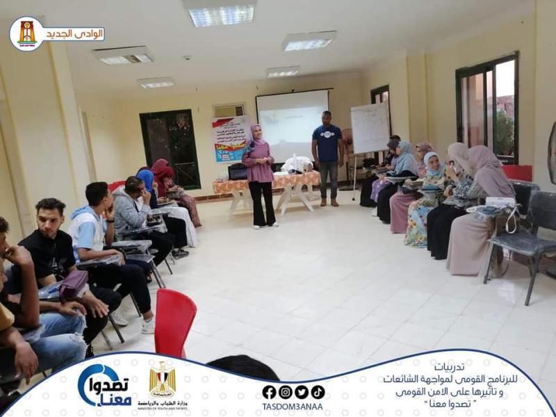 أعلنت وزارة الشباب والرياضة،بقيادة الدكتور أشرف صبحي ، عن تواصل فعاليات المرحلة الأولي من البرنامج القومي لمواجهة الشائعات، الذي يحمل شعار "تصدوا معنا"، حيث يستقبل مركزي شباب السبط والخارجة بالوادي الجديد ، فعاليات البرنامج علي مدار يومي الجمعة والسبت ، بمشاركة 120 متدربًا ومتدربة ، أعضاء مراكز الشباب .