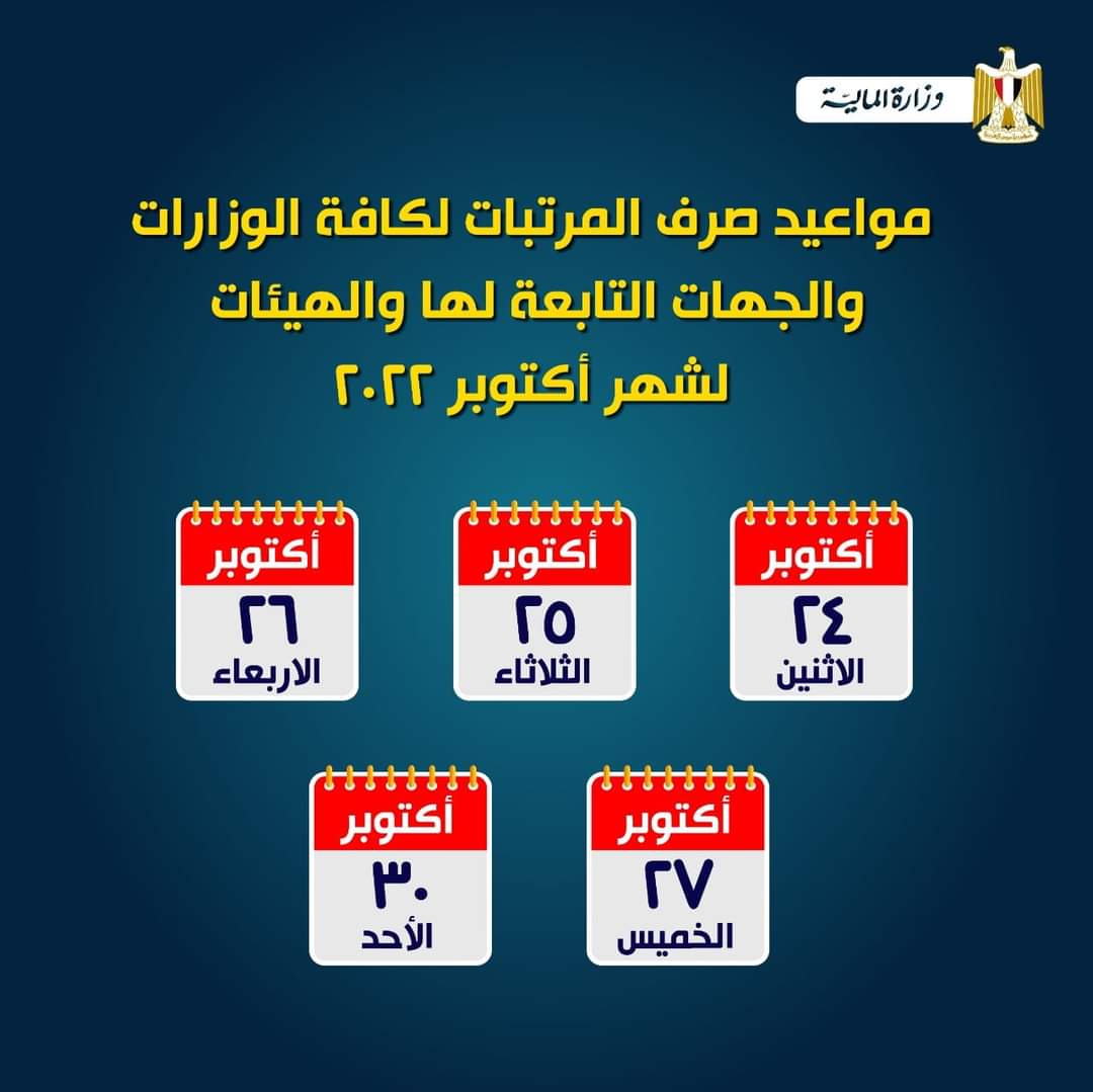 أكدت وزارة المالية، أنه سيتم بدء صرف مرتبات العاملين بالجهاز الإدارى للدولة غدا الاثنين 24 أكتوبر للعالمين بالوزارات والهيئات والجهات التابعة لها، وذلك لشهر أكتوبر.