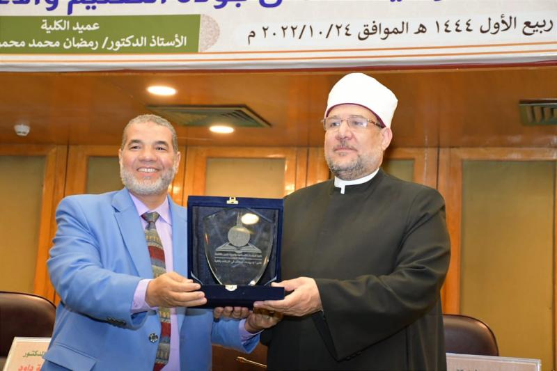 تقديرًا لجهوده في تجديد الخطاب الديني ونشر الوعي وخدمة المجتمع أهدى أ.د/ رمضان حسان عميد كلية الدراسات الإسلامية والعربية بجامعة الأزهر درع الكلية لمعالي أ.د/ محمد مختار جمعة وزير الأوقاف بحضور فضيلة أ.د/ سلامة داوود رئيس جامعة الأزهر، مشيدًا بجهود وزير الأوقاف في نشر الوعي وخدمة المجتمع، مؤكدًا أنه أحد أبناء كلية الدراسات الإسلامية والعربية، وهو أول عميد منتخب للكلية في تاريخها.