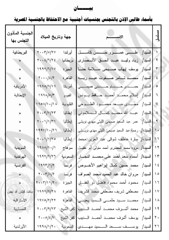 نشرت الجريدة الرسمية صباح اليوم الثلاثاء، قرار وزارة الداخلية بالإذن لـ21 شخصا بالتجنس بجنسيات أجنبية مرفقة مقابل كل اسم فى الكشوف التالية، مع الاحتفاظ بالجنسية المصرية، صدر القرار بعد الاطلاع على القانون رقم 26 لسنة 1975 الصادر بشأن الجنسية المصرية.