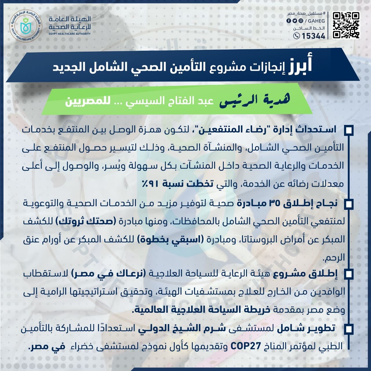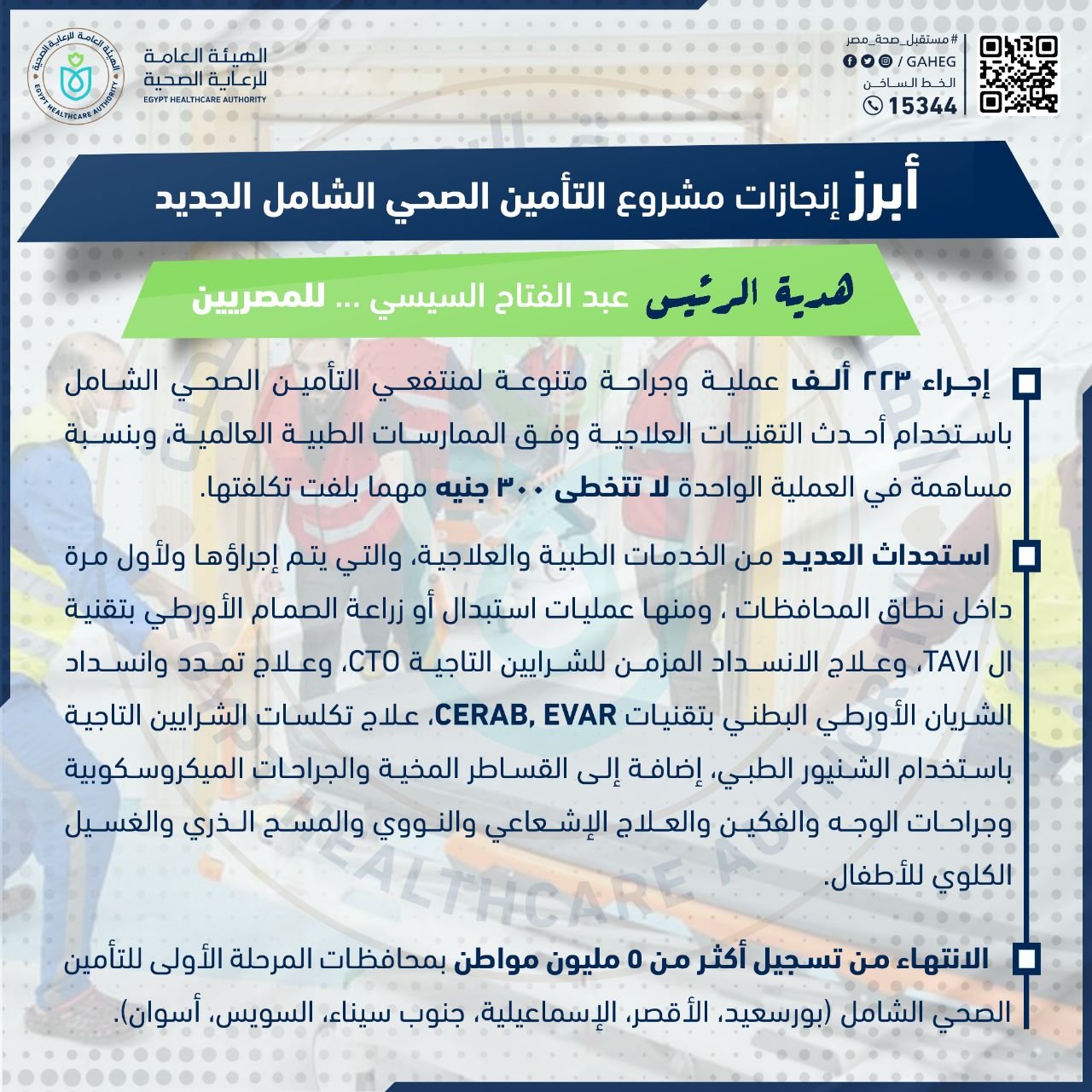 أعلنت الهيئة العامة للرعاية الصحية، برئاسة الدكتور أحمد السبكي رئيس مجلس إدارة الهيئة، ومساعد وزير الصحة والسكان والمشرف العام على مشروع التأمين الصحي الشامل الجديدة، عن أبرز إنجازات الهيئة، باعتبارها ذراع الدولة الرئيسي في ضبط وتنظيم تقديم خدمات منظومة التأمين الصحي الشامل الجديدة، والتي شملت:-