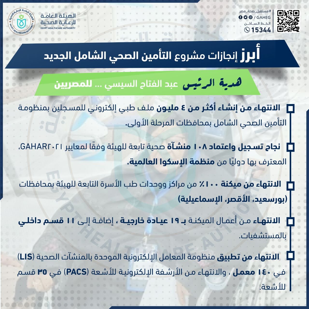 بعد مرور 3 سنوات من إطلاق فخامة رئيس جمهورية مصر العربية، الرئيس عبد الفتاح السيسي القائد التاريخي للإصلاح الصحي الشامل في مصر، لمنظومة التأمين الصحي الشامل الجديدة، وذلك من محافظة بورسعيد في يوليو 2019 ، معلنًا تشغيل المنظومة رسميًا في نوفمبر من ذات العام...