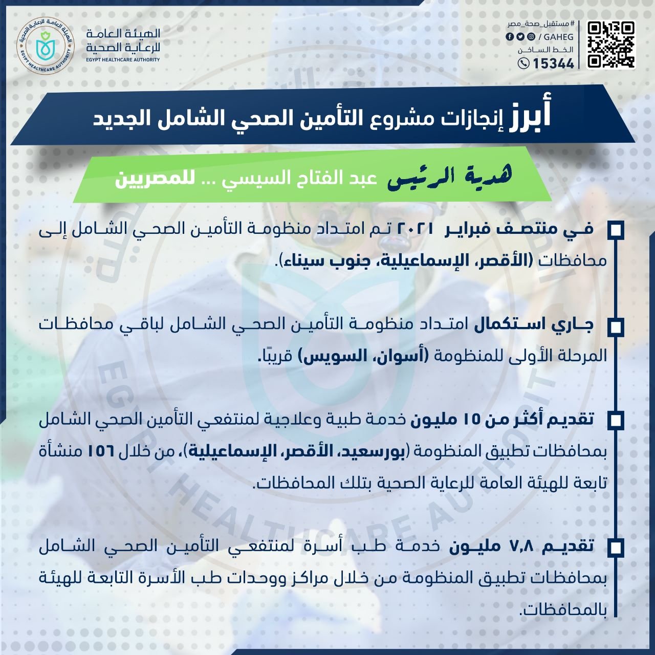 تقديم 15 مليون خدمة طبية وعلاجية من خلال 156 منشأة طبية تابعة للهيئة العامة للرعاية الصحية بالمحافظات الثلاث لمنظومة التأمين الصحي الشامل (بورسعيد، الأقصر، الإسماعيلية).