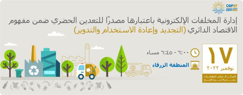 تُعلن وزارة الاتصالات وتكنولوجيا المعلومات عن انعقاد جلسة نقاشية بعنوان "إدارة المخلفات الإلكترونية باعتبارها مصدرًا للتعدين الحضري ضمن مفهوم الاقتصاد الدائري (التجديد وإعادة الاستخدام والتدوير)" وذلك ضمن فعاليات "يوم الحلول" المنعقد خلال مؤتمر الأمم المتحدة المعني بتغيّر المناخ COP27 بشرم الشيخ. وتناقش الجلسة عدة موضوعات منها تزايد حجم المخلفات الإلكترونية الناتجة عن عملية تسريع التحول الرقمي الحالية والمتوقعة، وتأثير المواد الخطرة على البيئة وصحة المواطنين، وكذلك مستقبل صناعة المخلفات الإلكترونية وأهميته، لا سيما في أفريقيا.