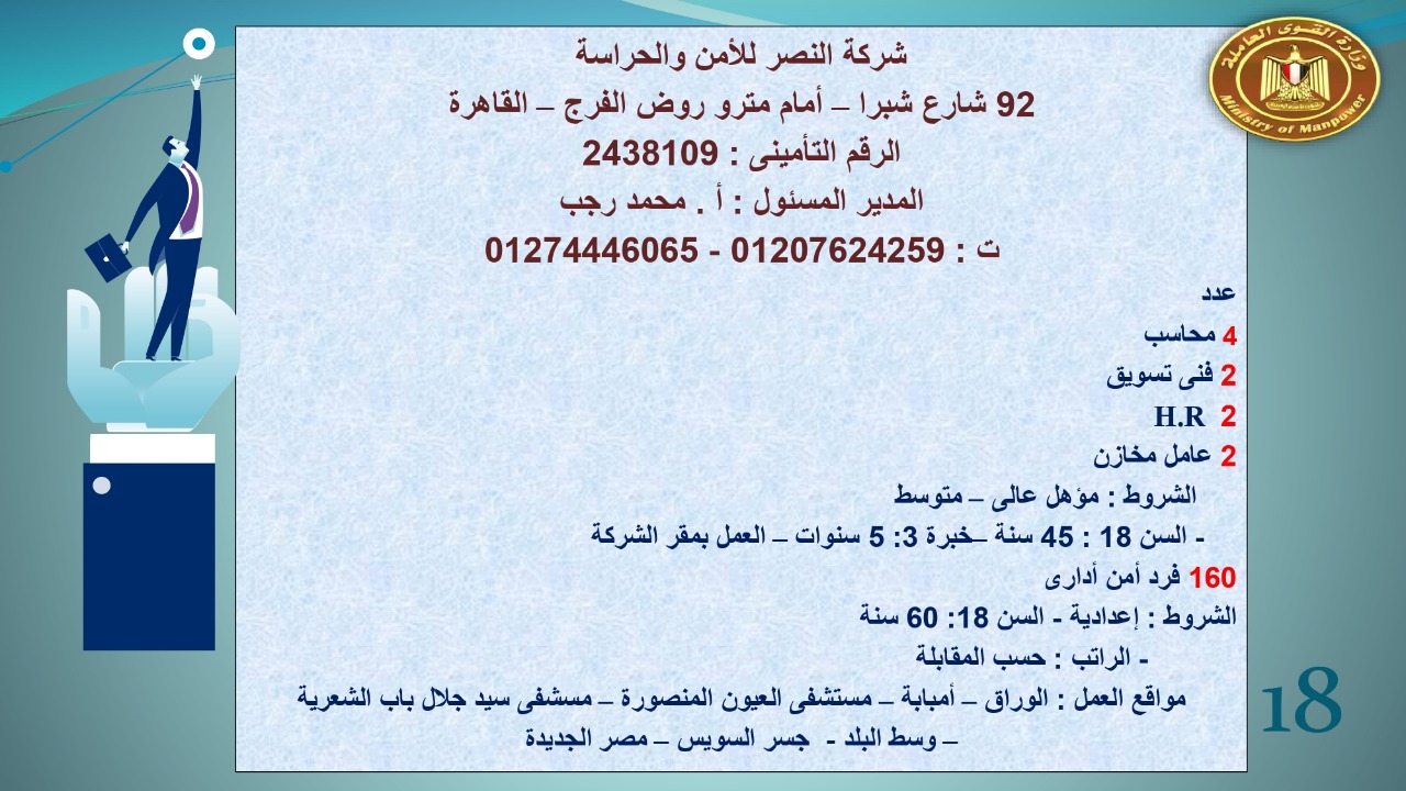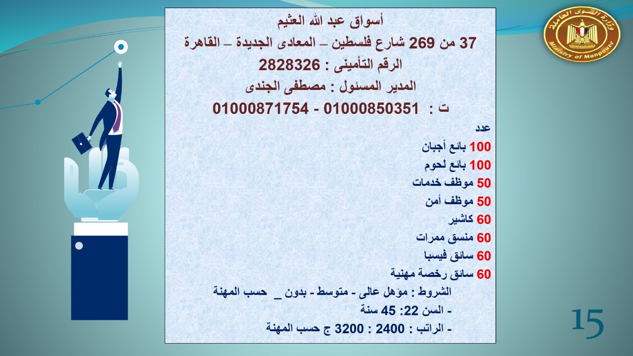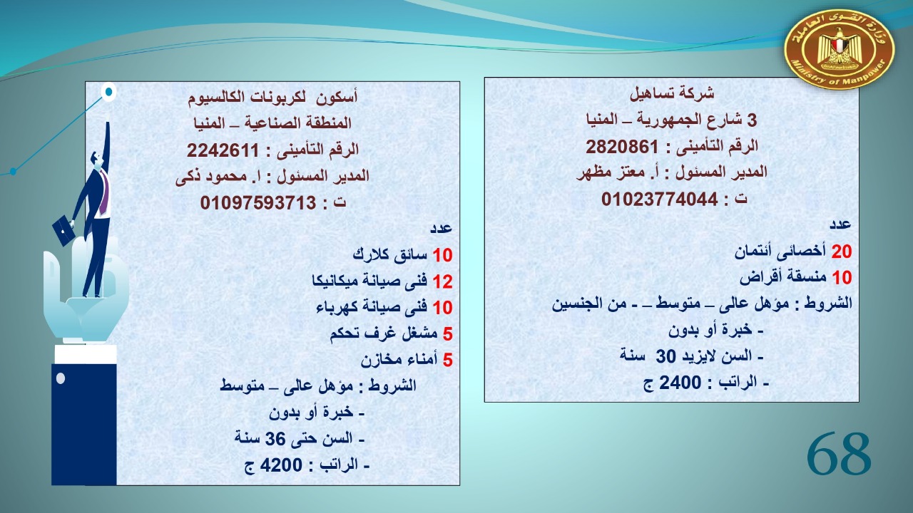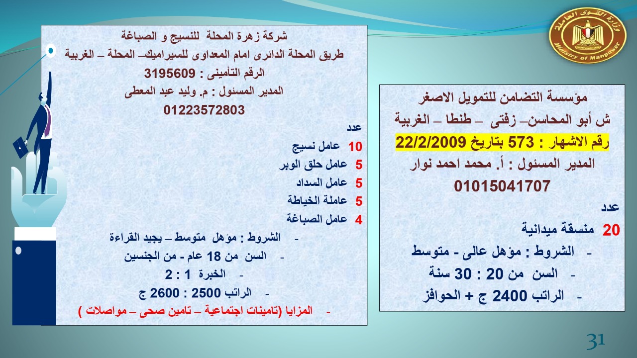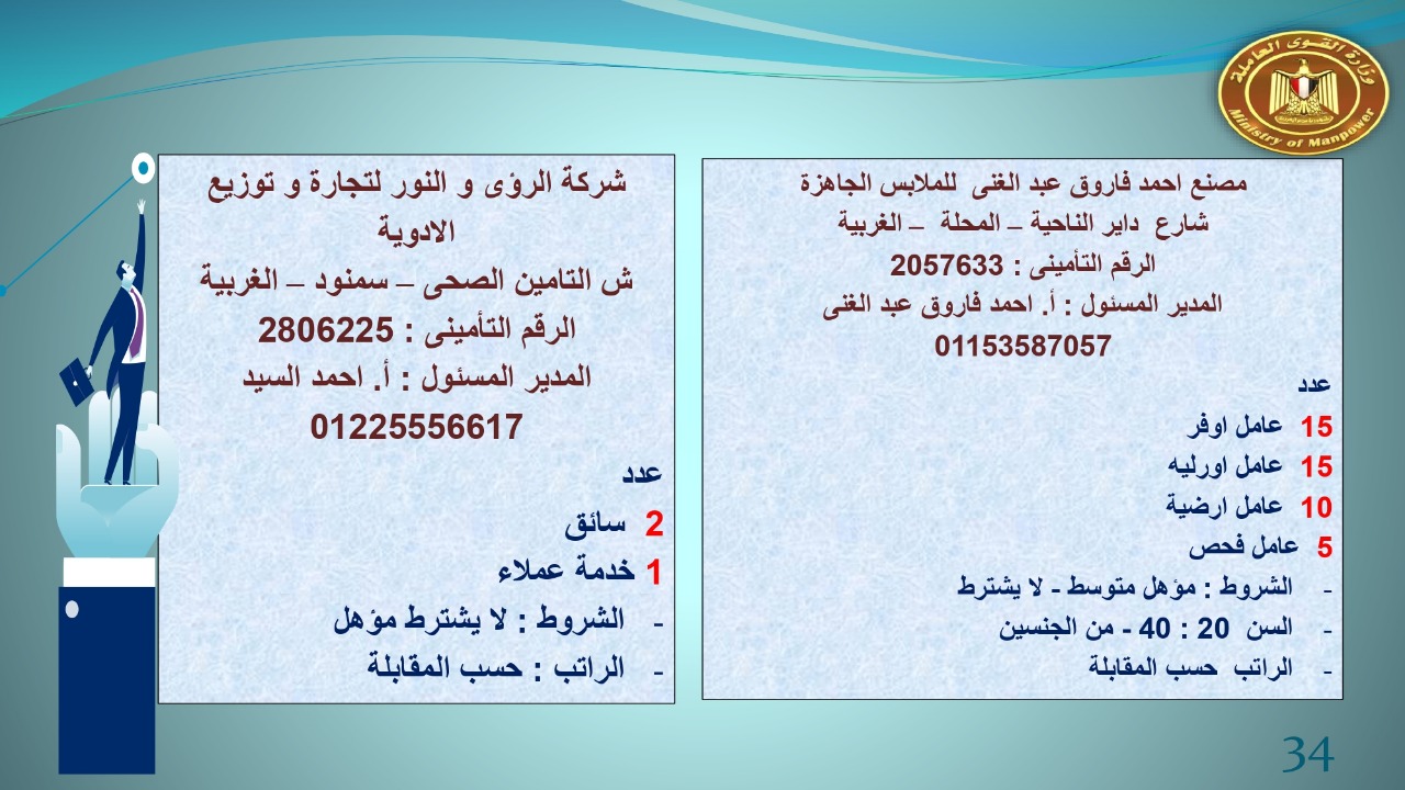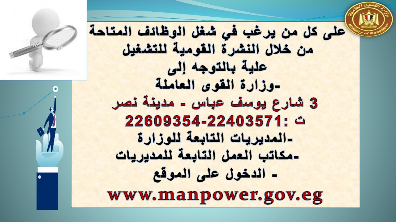 وجاء في بيان صحفي اليوم الإثنين ،أن نشرة التوظيف الدورية التي تصدر عن "الوزارة" ،تعلن عن فرص عمل جديدة ،متوفرة في 14 محافظة، هي : القاهرة ، الشرقية ، القليوبية ، الغربية ، البحيرة ، دمياط، بورسعيد ، جنوب سيناء ، الوادي الجديد، قنا، أسيوط ، شمال سيناء ، قنا ، المنوفية .. وفي التخصصات الأتية : مهندسين ، ومشرفين ، ومسئول فرع ، وبائعين ، وعمال إنتاج ، وكول سنتر ، ومندوبين مبيعات ، وسائقين ، وعمال تفصيل وحياكة بكافة تخصصاتها ، ومهن فنية ، وأفراد امن فى مواقع متميزة ، وكيميائيين ، واخصائيين تمويل وخدمات مالية ، وكافة تخصصات وظائف الفندقة ، وتخصصات أخرى .