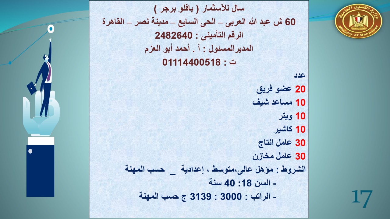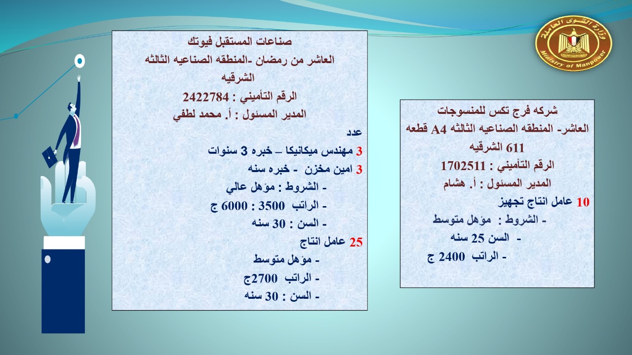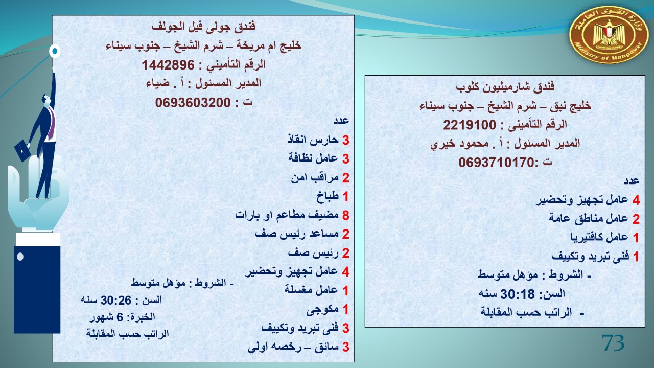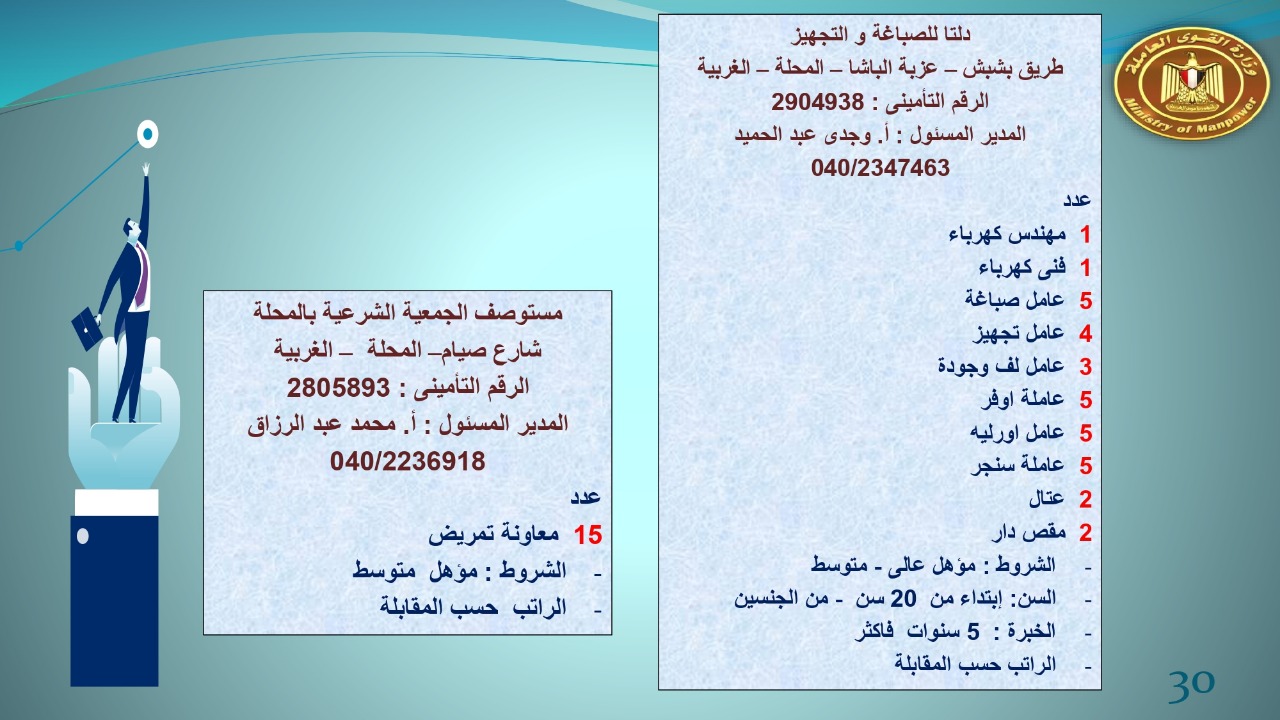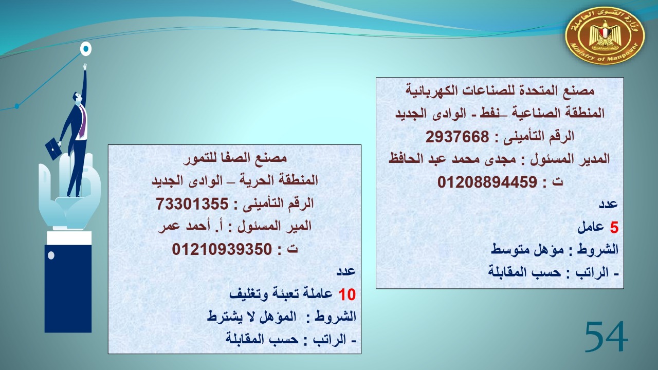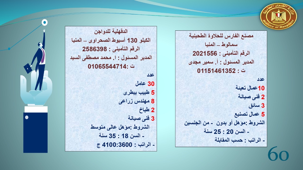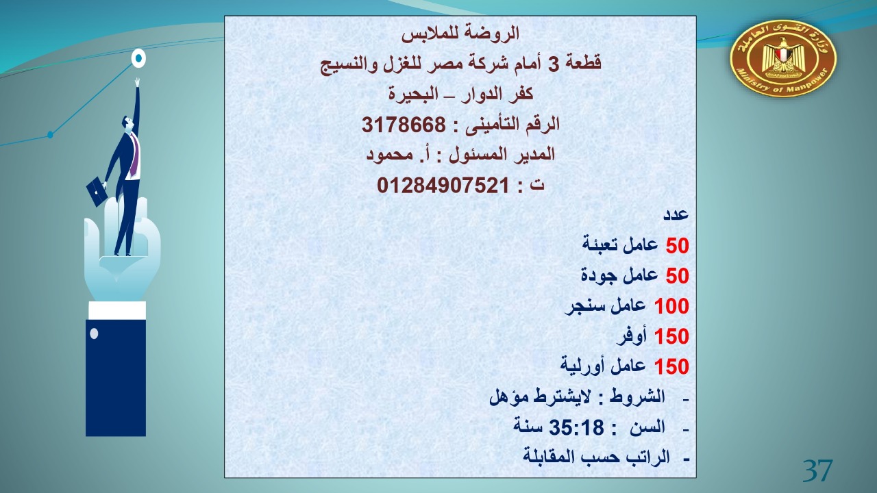 وجاء في بيان صحفي اليوم الإثنين ،أن نشرة التوظيف الدورية التي تصدر عن "الوزارة" ،تعلن عن فرص عمل جديدة ،متوفرة في 14 محافظة، هي : القاهرة ، الشرقية ، القليوبية ، الغربية ، البحيرة ، دمياط، بورسعيد ، جنوب سيناء ، الوادي الجديد، قنا، أسيوط ، شمال سيناء ، قنا ، المنوفية .. وفي التخصصات الأتية : مهندسين ، ومشرفين ، ومسئول فرع ، وبائعين ، وعمال إنتاج ، وكول سنتر ، ومندوبين مبيعات ، وسائقين ، وعمال تفصيل وحياكة بكافة تخصصاتها ، ومهن فنية ، وأفراد امن فى مواقع متميزة ، وكيميائيين ، واخصائيين تمويل وخدمات مالية ، وكافة تخصصات وظائف الفندقة ، وتخصصات أخرى .