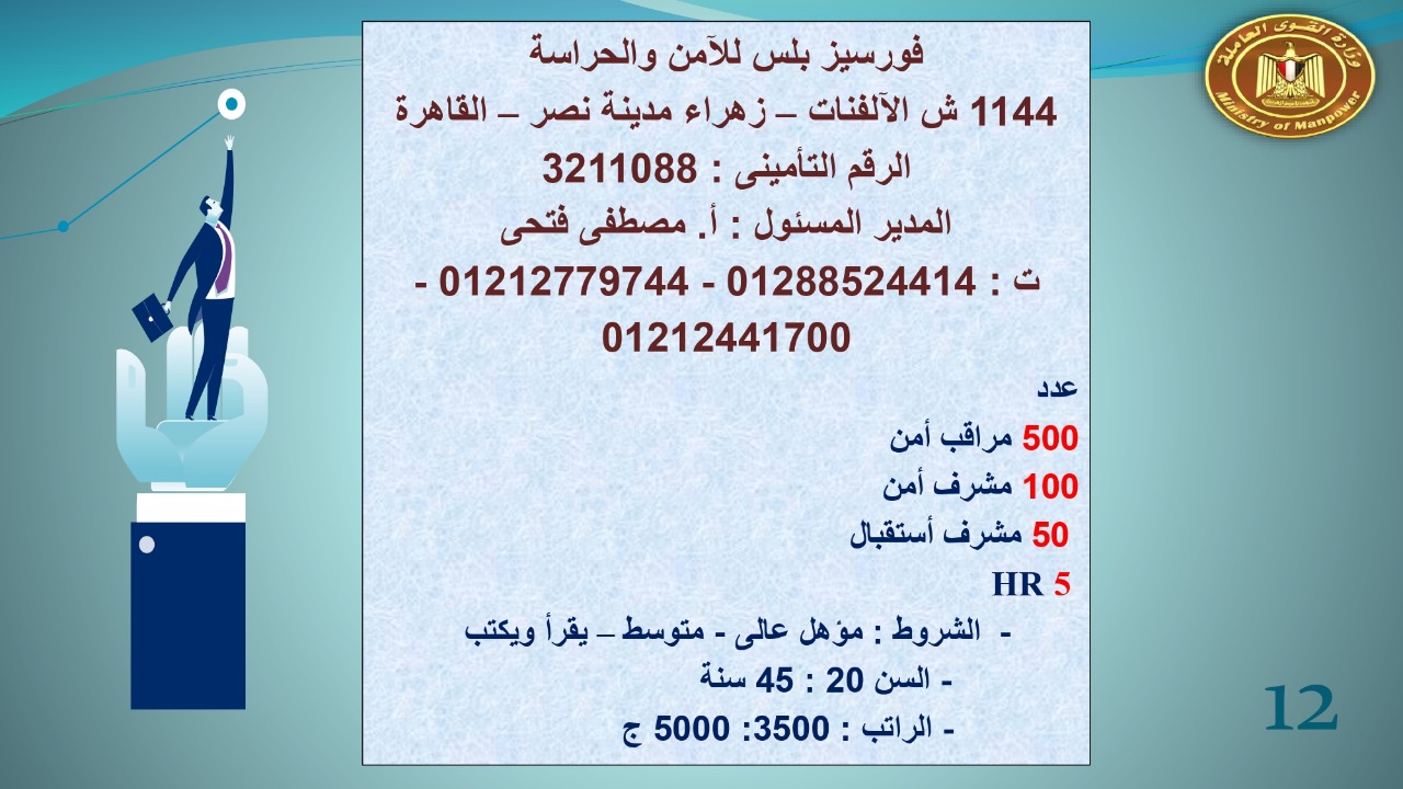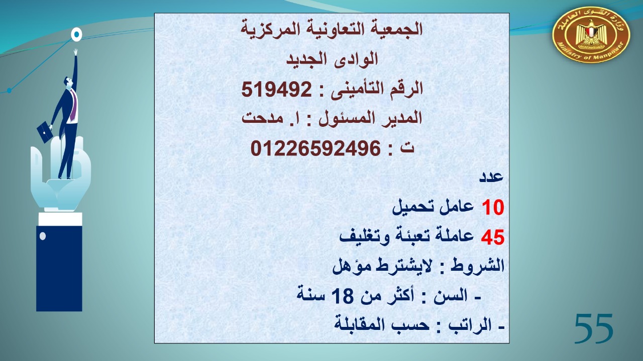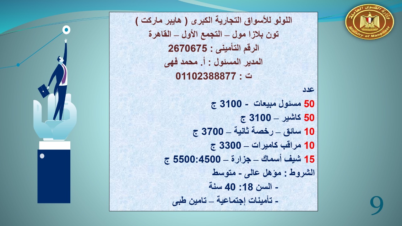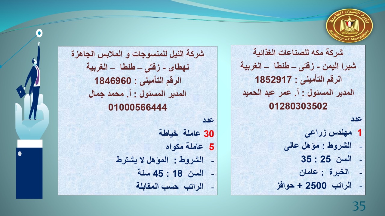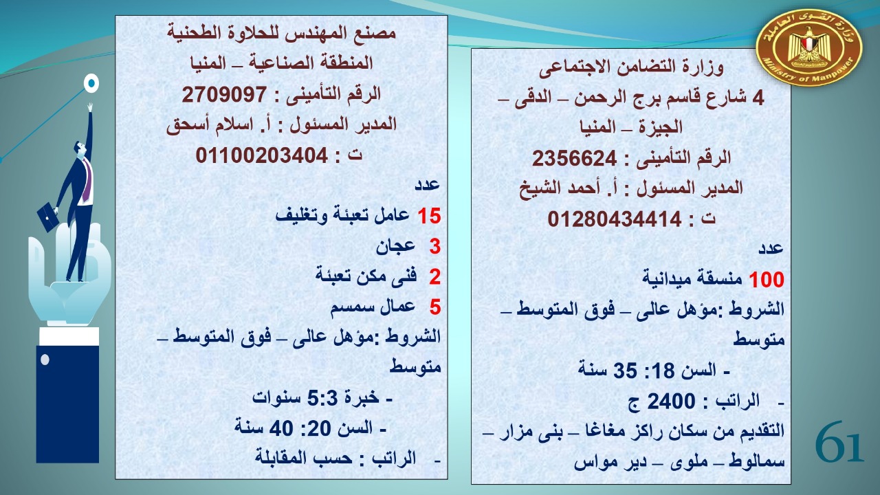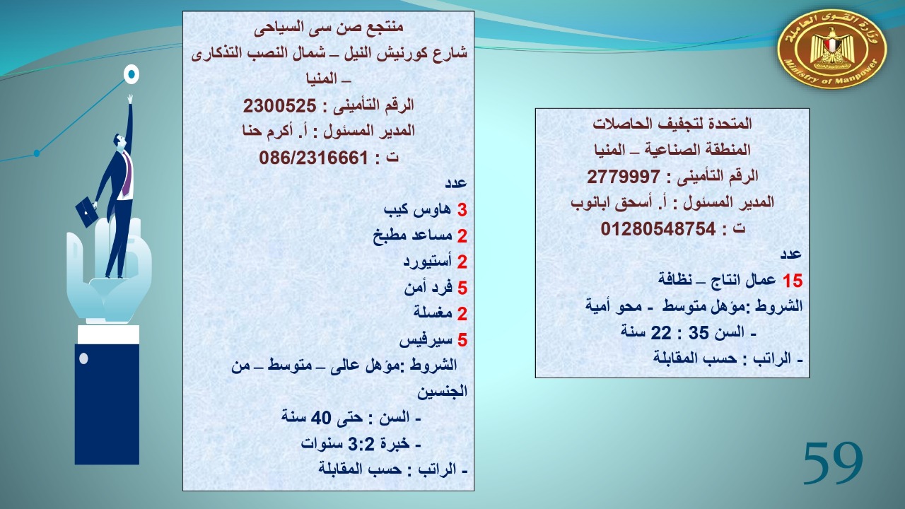 وجاء في بيان صحفي اليوم الإثنين ،أن نشرة التوظيف الدورية التي تصدر عن "الوزارة" ،تعلن عن فرص عمل جديدة ،متوفرة في 14 محافظة، هي : القاهرة ، الشرقية ، القليوبية ، الغربية ، البحيرة ، دمياط، بورسعيد ، جنوب سيناء ، الوادي الجديد، قنا، أسيوط ، شمال سيناء ، قنا ، المنوفية .. وفي التخصصات الأتية : مهندسين ، ومشرفين ، ومسئول فرع ، وبائعين ، وعمال إنتاج ، وكول سنتر ، ومندوبين مبيعات ، وسائقين ، وعمال تفصيل وحياكة بكافة تخصصاتها ، ومهن فنية ، وأفراد امن فى مواقع متميزة ، وكيميائيين ، واخصائيين تمويل وخدمات مالية ، وكافة تخصصات وظائف الفندقة ، وتخصصات أخرى .
