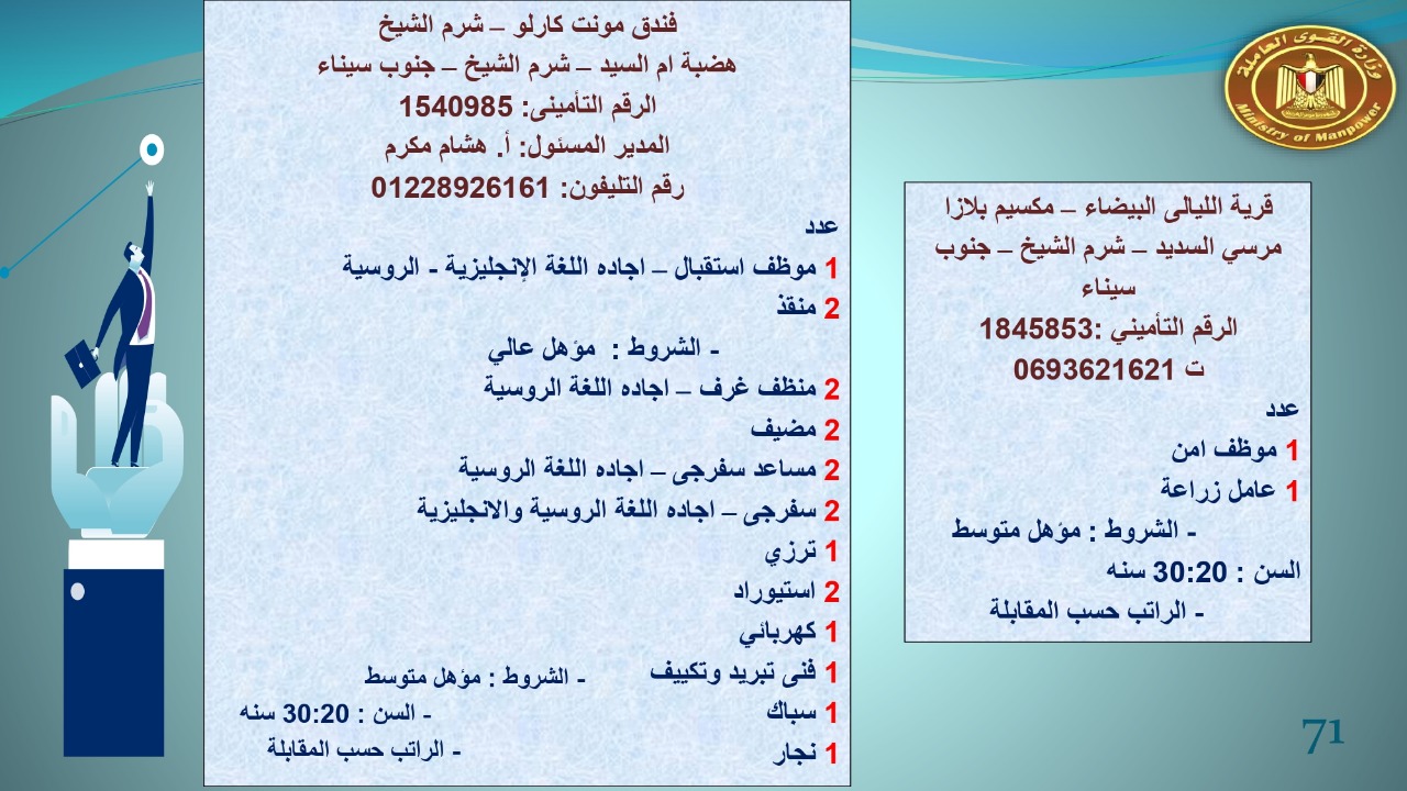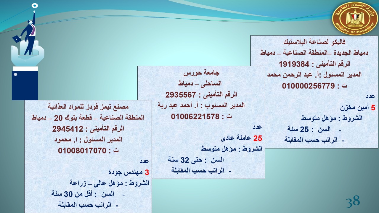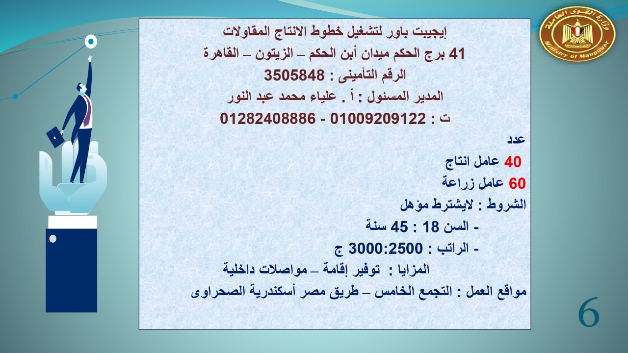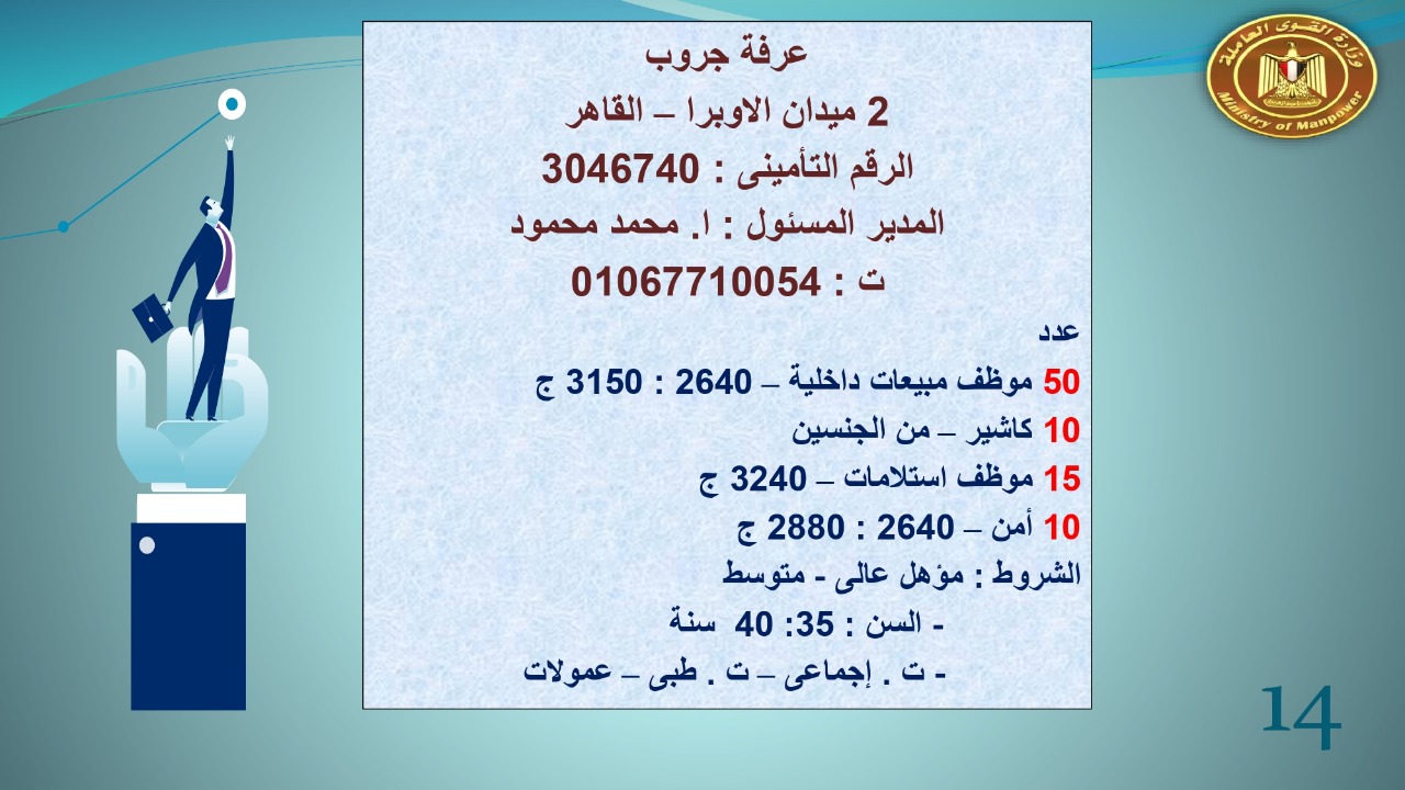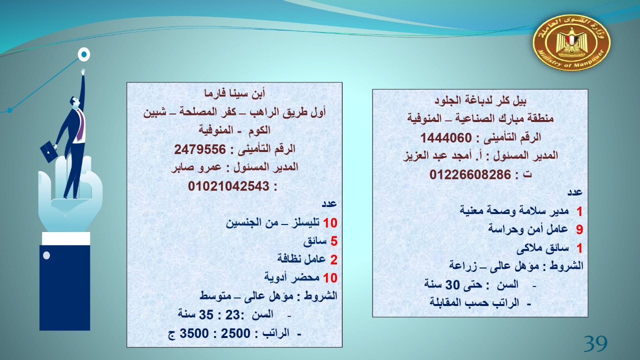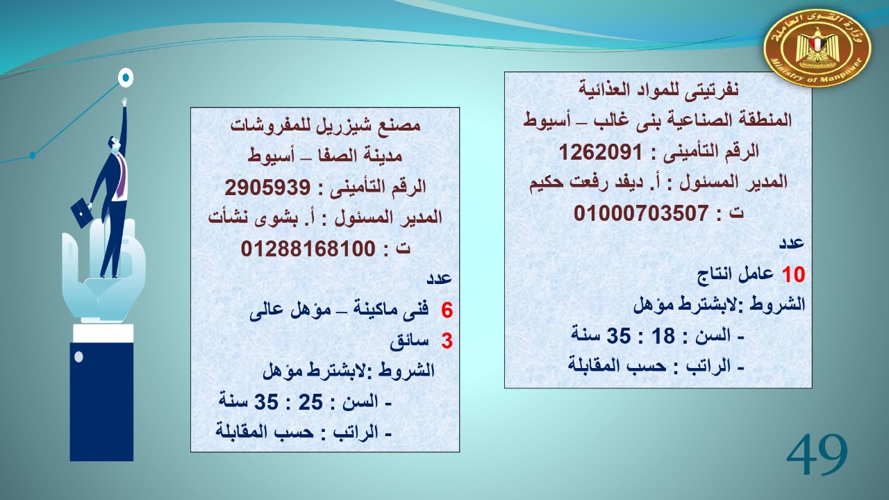 وجاء في بيان صحفي اليوم الإثنين ،أن نشرة التوظيف الدورية التي تصدر عن "الوزارة" ،تعلن عن فرص عمل جديدة ،متوفرة في 14 محافظة، هي : القاهرة ، الشرقية ، القليوبية ، الغربية ، البحيرة ، دمياط، بورسعيد ، جنوب سيناء ، الوادي الجديد، قنا، أسيوط ، شمال سيناء ، قنا ، المنوفية .. وفي التخصصات الأتية : مهندسين ، ومشرفين ، ومسئول فرع ، وبائعين ، وعمال إنتاج ، وكول سنتر ، ومندوبين مبيعات ، وسائقين ، وعمال تفصيل وحياكة بكافة تخصصاتها ، ومهن فنية ، وأفراد امن فى مواقع متميزة ، وكيميائيين ، واخصائيين تمويل وخدمات مالية ، وكافة تخصصات وظائف الفندقة ، وتخصصات أخرى .