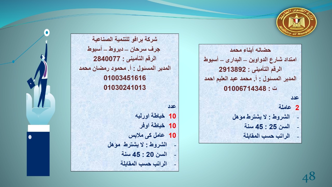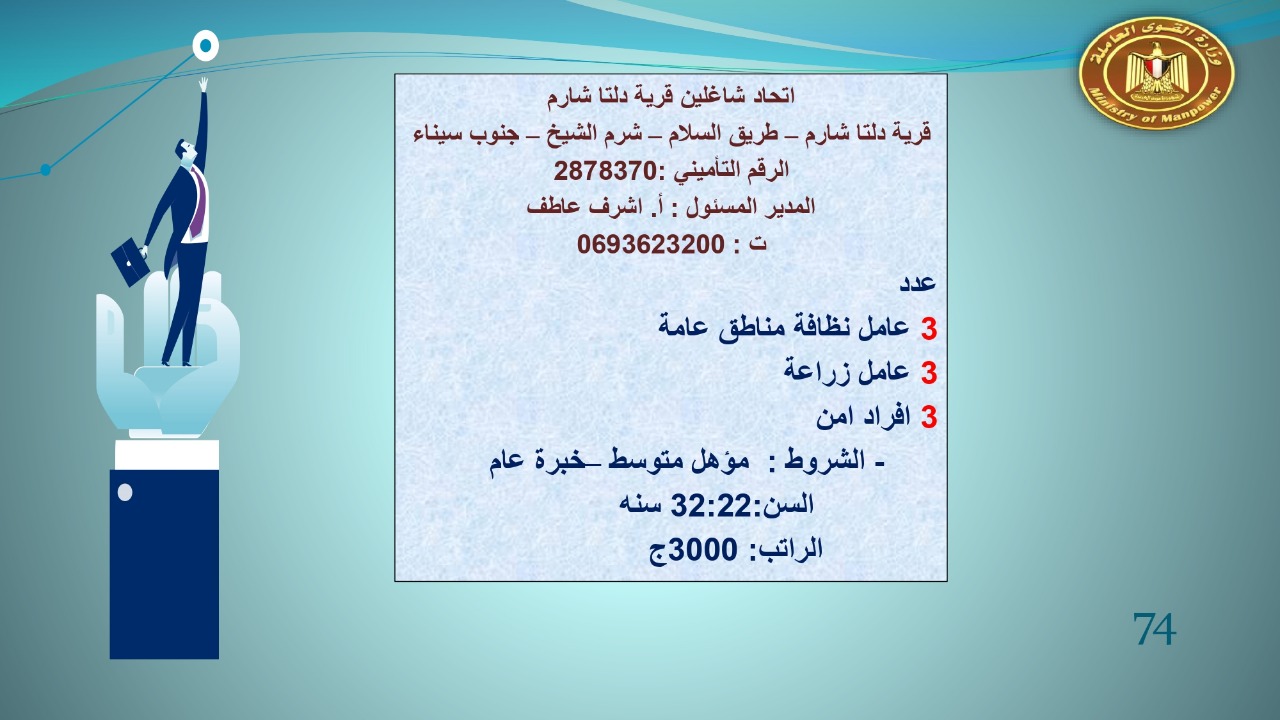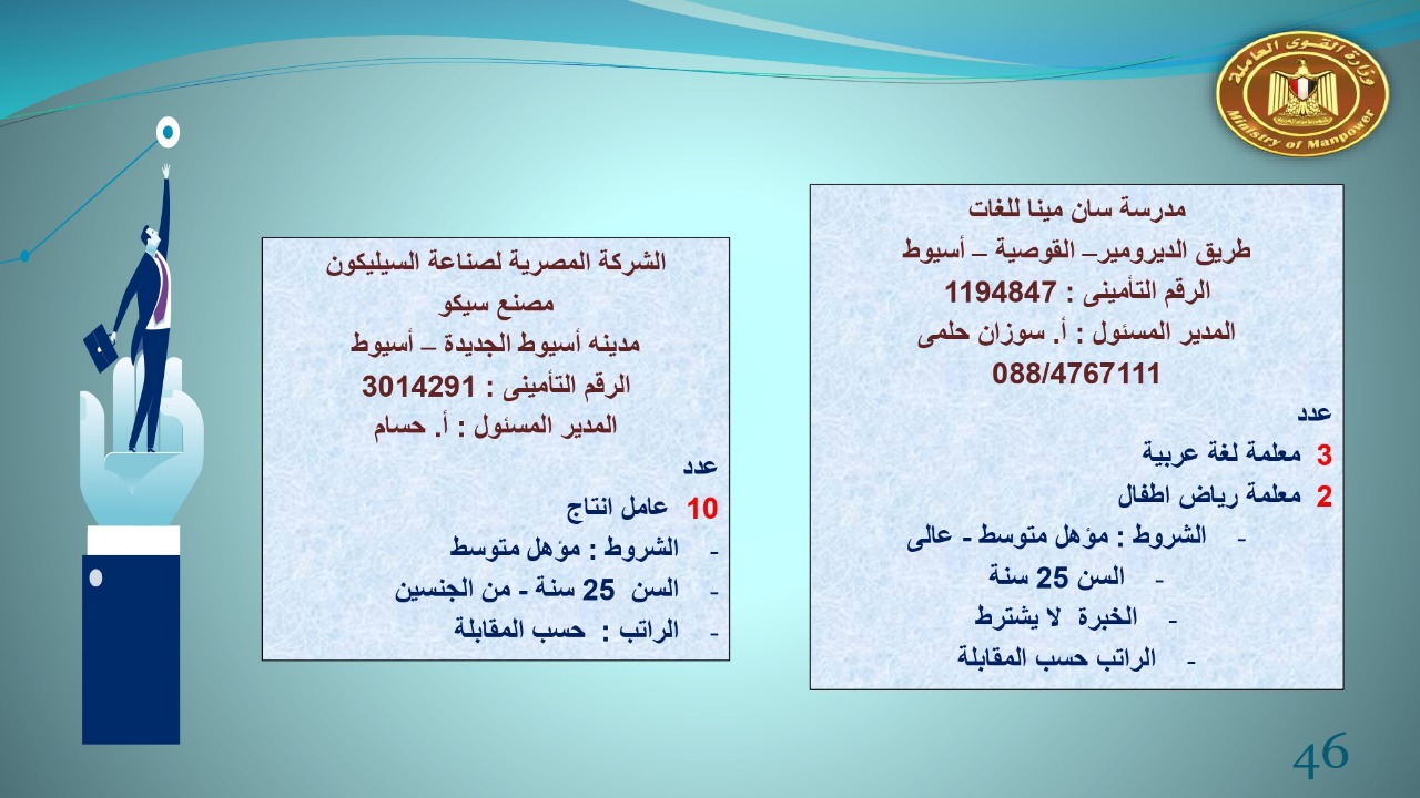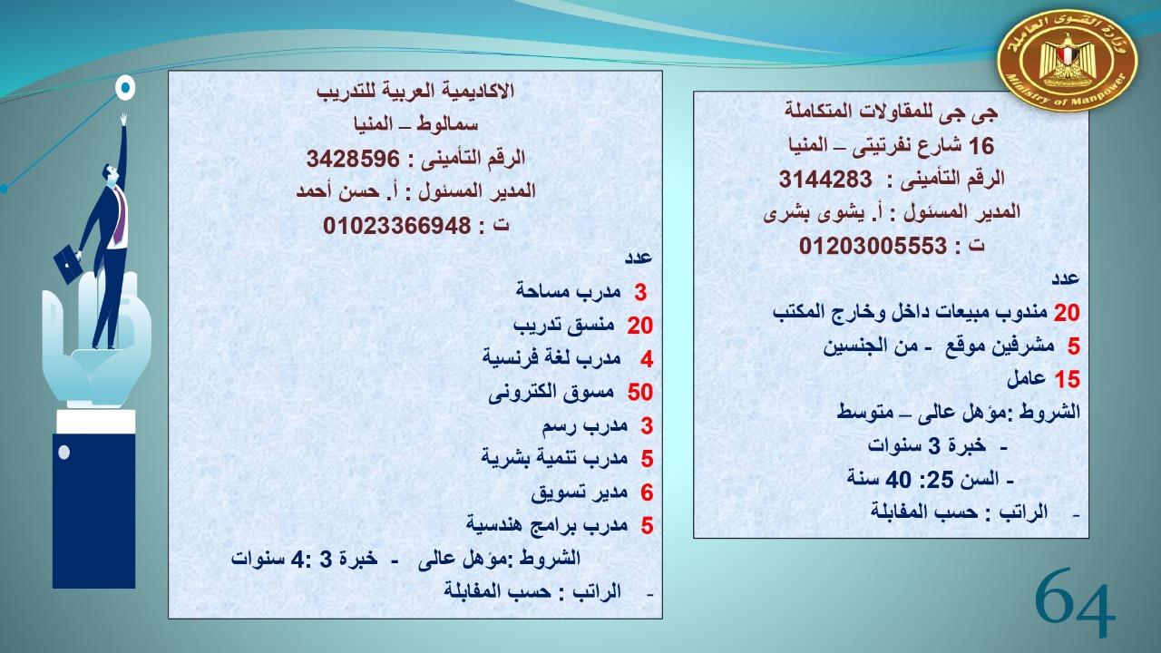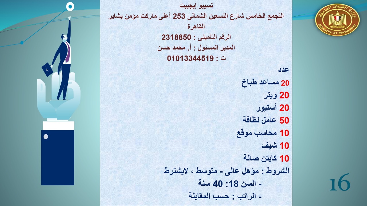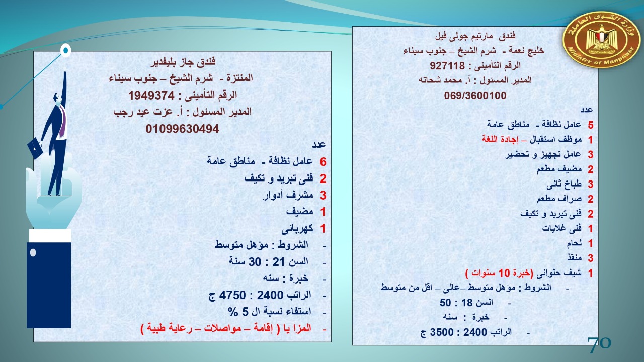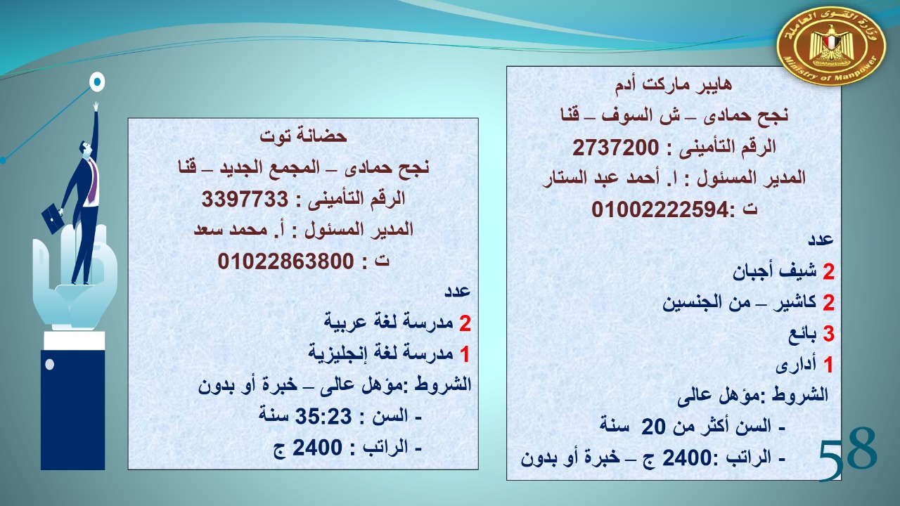 وجاء في بيان صحفي اليوم الإثنين ،أن نشرة التوظيف الدورية التي تصدر عن "الوزارة" ،تعلن عن فرص عمل جديدة ،متوفرة في 14 محافظة، هي : القاهرة ، الشرقية ، القليوبية ، الغربية ، البحيرة ، دمياط، بورسعيد ، جنوب سيناء ، الوادي الجديد، قنا، أسيوط ، شمال سيناء ، قنا ، المنوفية .. وفي التخصصات الأتية : مهندسين ، ومشرفين ، ومسئول فرع ، وبائعين ، وعمال إنتاج ، وكول سنتر ، ومندوبين مبيعات ، وسائقين ، وعمال تفصيل وحياكة بكافة تخصصاتها ، ومهن فنية ، وأفراد امن فى مواقع متميزة ، وكيميائيين ، واخصائيين تمويل وخدمات مالية ، وكافة تخصصات وظائف الفندقة ، وتخصصات أخرى .