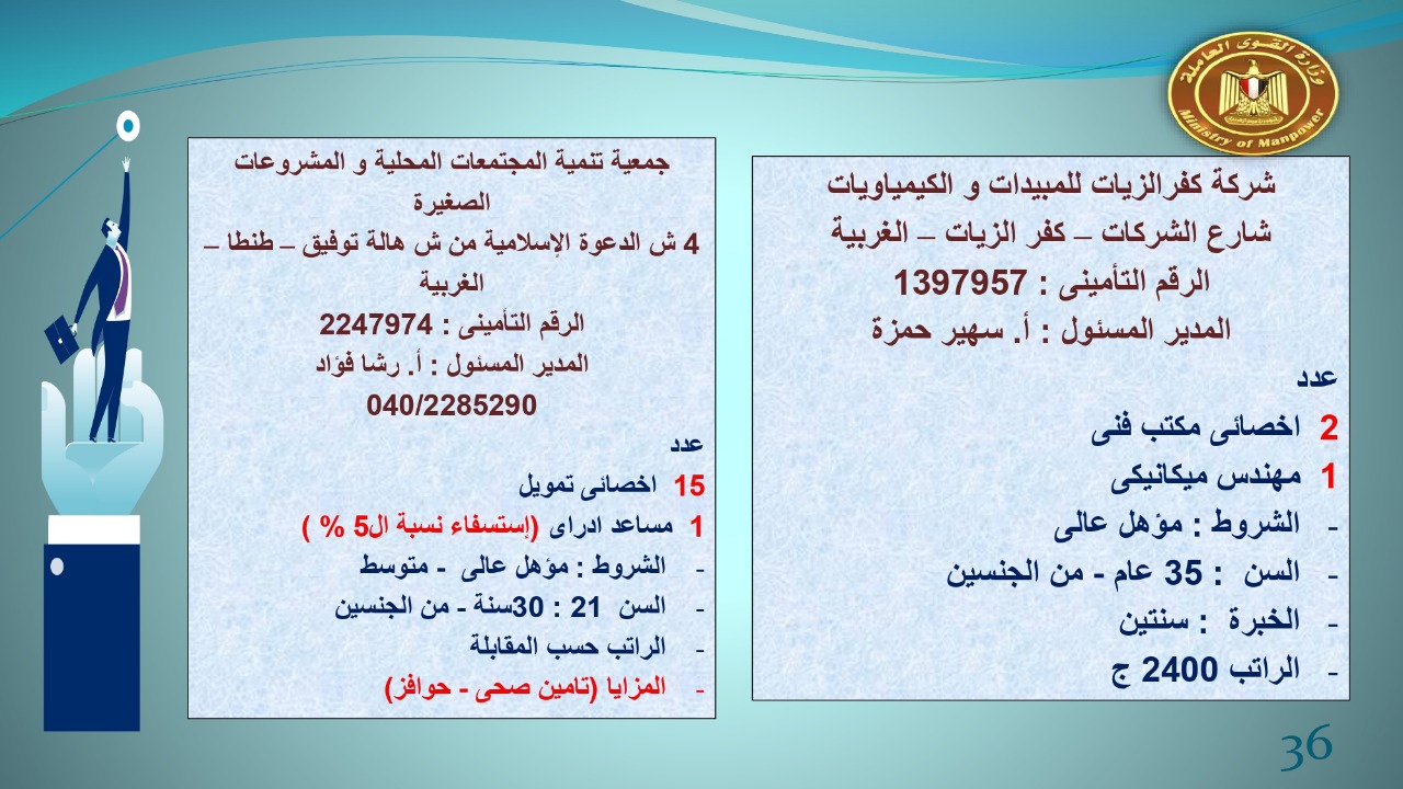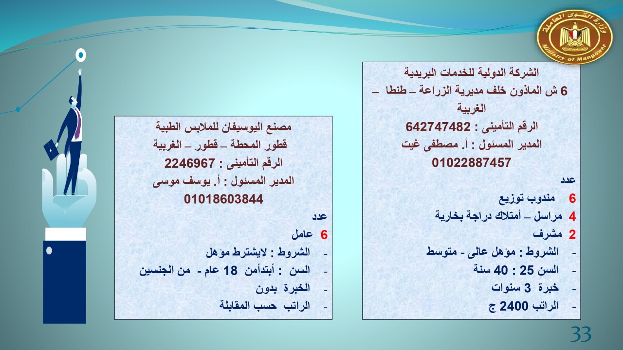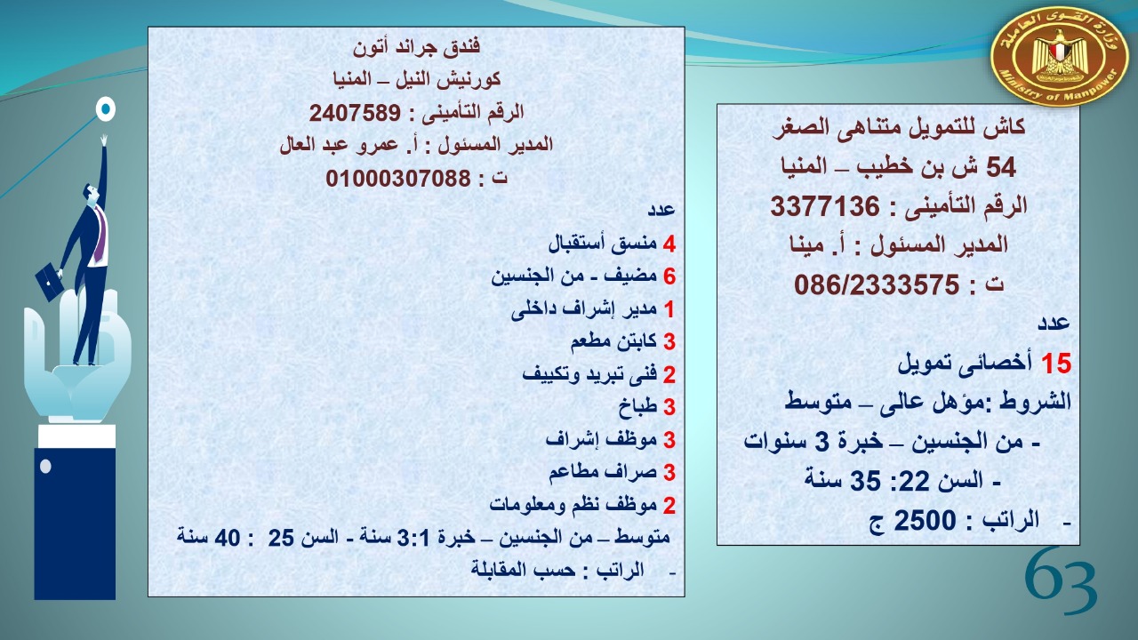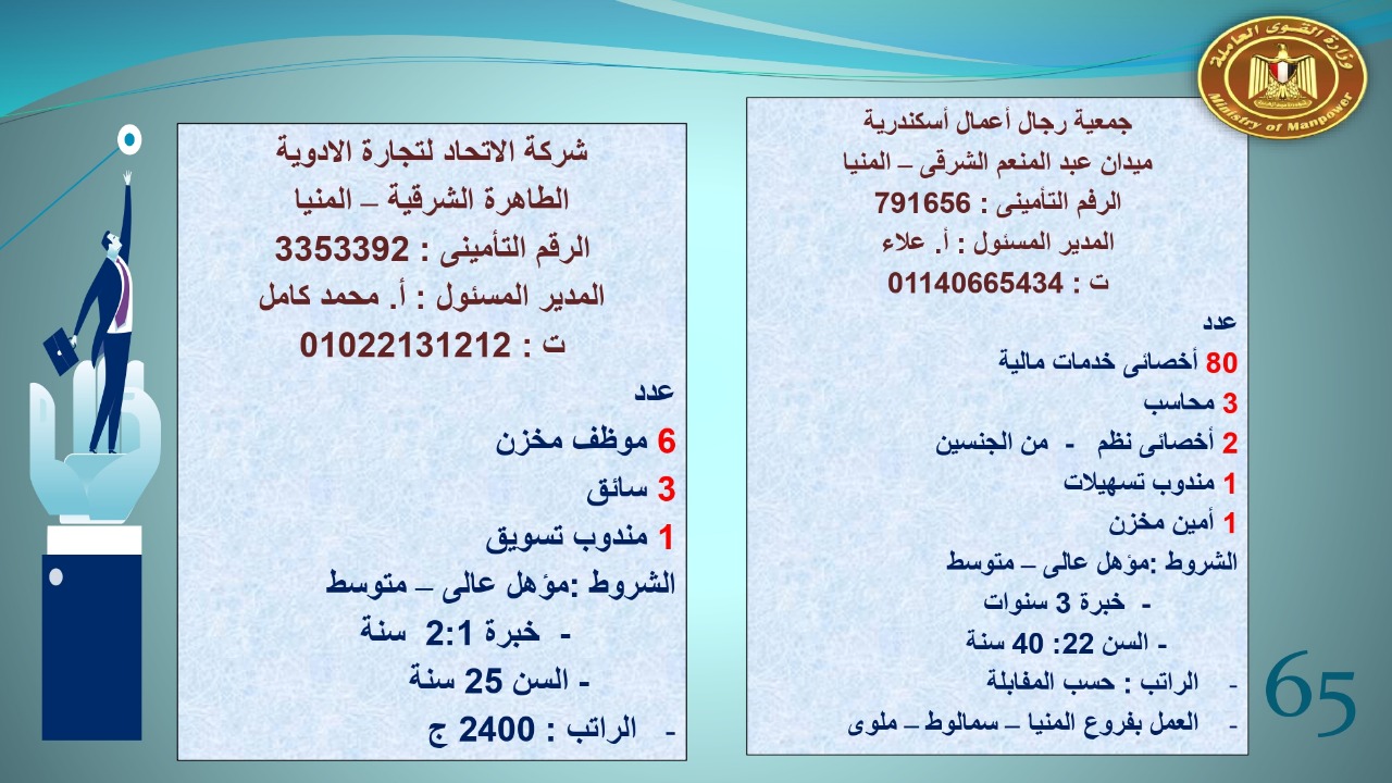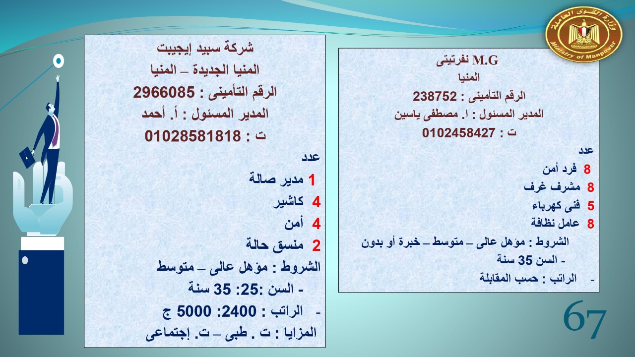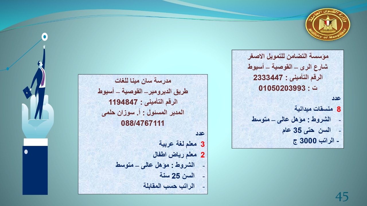 وجاء في بيان صحفي اليوم الإثنين ،أن نشرة التوظيف الدورية التي تصدر عن "الوزارة" ،تعلن عن فرص عمل جديدة ،متوفرة في 14 محافظة، هي : القاهرة ، الشرقية ، القليوبية ، الغربية ، البحيرة ، دمياط، بورسعيد ، جنوب سيناء ، الوادي الجديد، قنا، أسيوط ، شمال سيناء ، قنا ، المنوفية .. وفي التخصصات الأتية : مهندسين ، ومشرفين ، ومسئول فرع ، وبائعين ، وعمال إنتاج ، وكول سنتر ، ومندوبين مبيعات ، وسائقين ، وعمال تفصيل وحياكة بكافة تخصصاتها ، ومهن فنية ، وأفراد امن فى مواقع متميزة ، وكيميائيين ، واخصائيين تمويل وخدمات مالية ، وكافة تخصصات وظائف الفندقة ، وتخصصات أخرى .