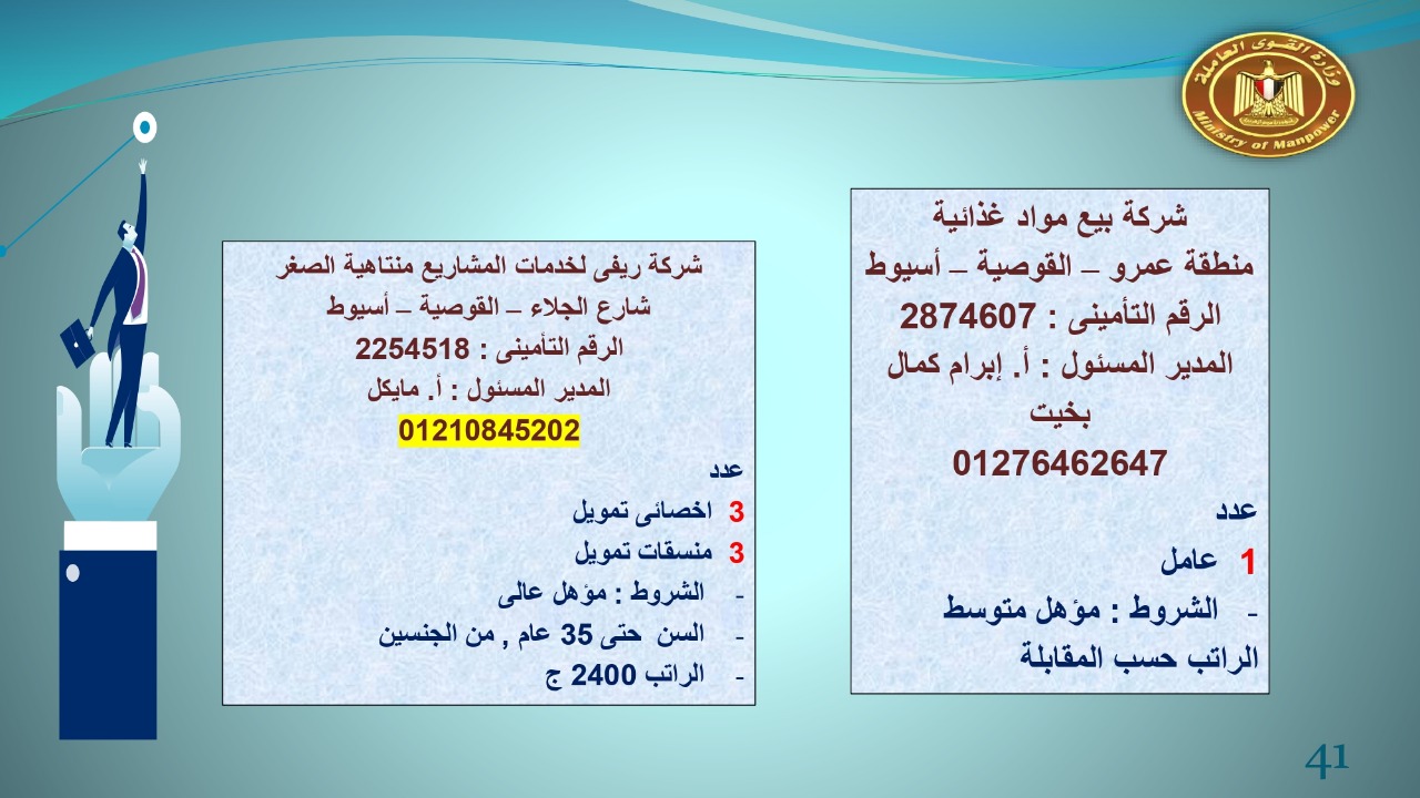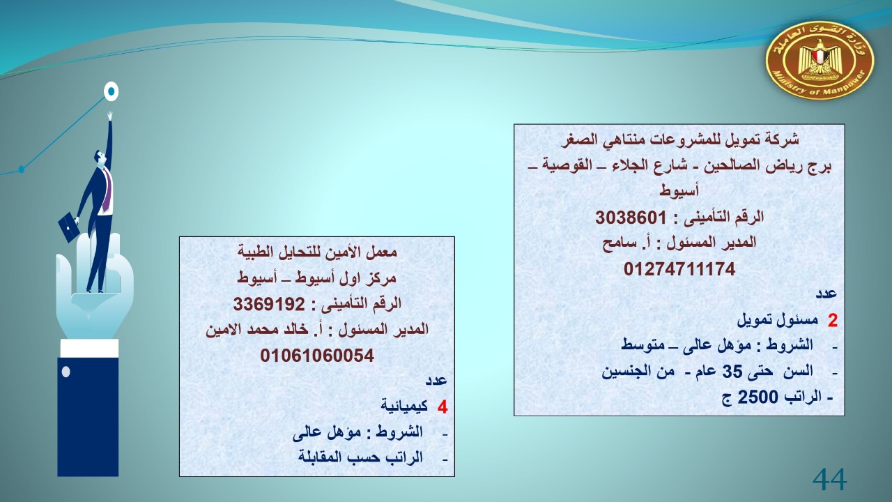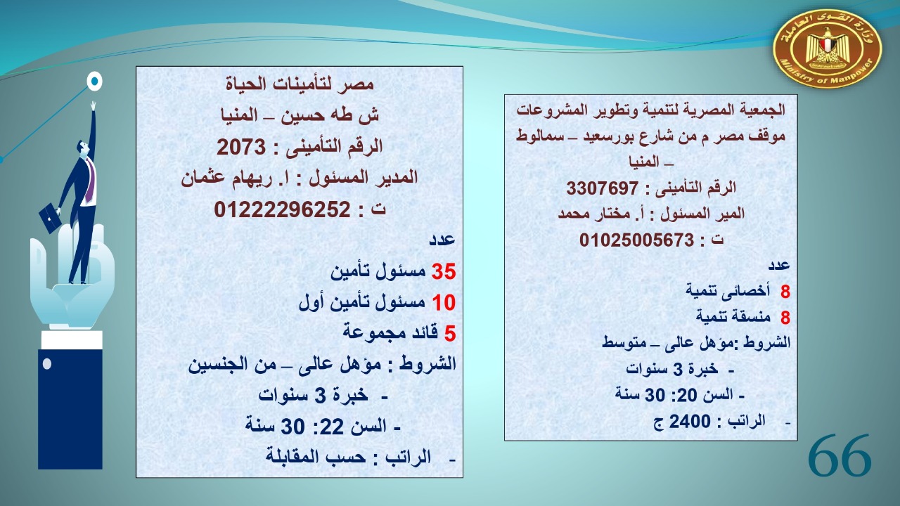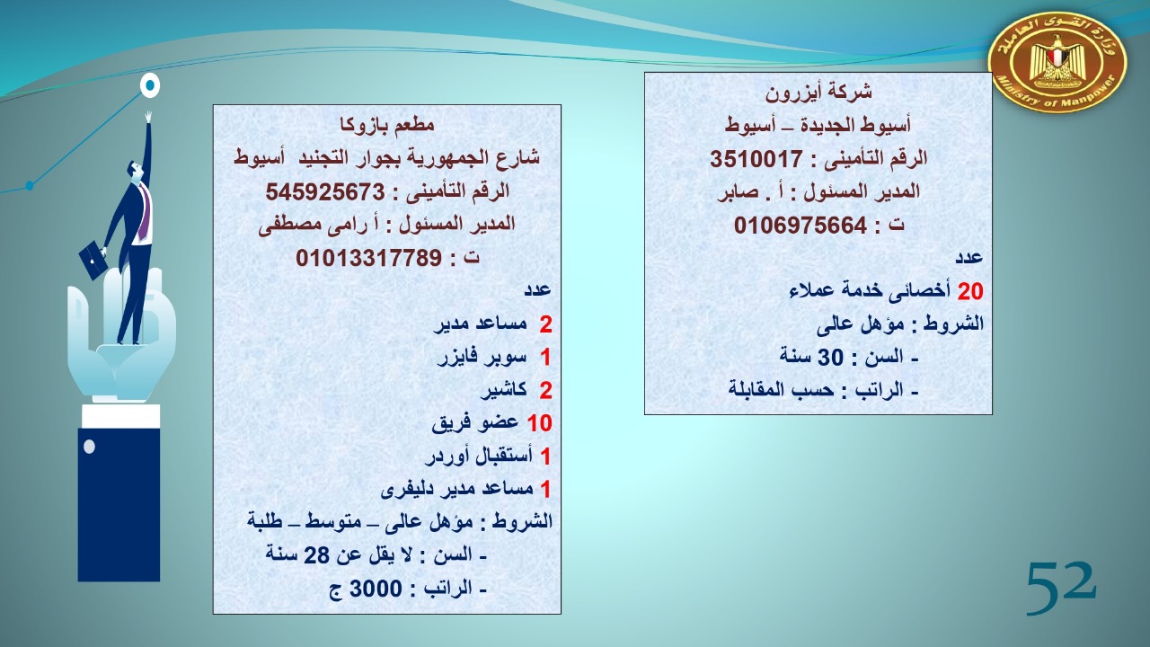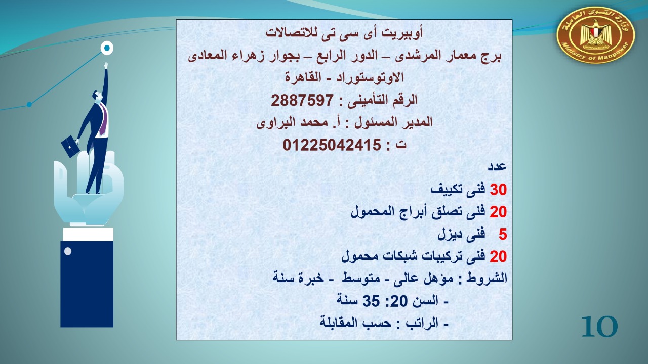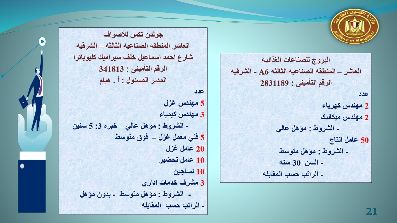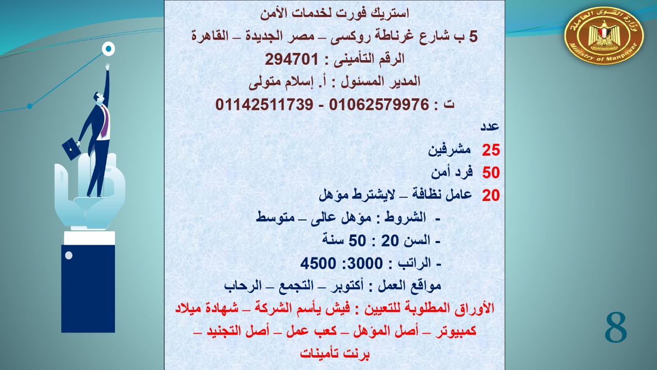 وجاء في بيان صحفي اليوم الإثنين ،أن نشرة التوظيف الدورية التي تصدر عن "الوزارة" ،تعلن عن فرص عمل جديدة ،متوفرة في 14 محافظة، هي : القاهرة ، الشرقية ، القليوبية ، الغربية ، البحيرة ، دمياط، بورسعيد ، جنوب سيناء ، الوادي الجديد، قنا، أسيوط ، شمال سيناء ، قنا ، المنوفية .. وفي التخصصات الأتية : مهندسين ، ومشرفين ، ومسئول فرع ، وبائعين ، وعمال إنتاج ، وكول سنتر ، ومندوبين مبيعات ، وسائقين ، وعمال تفصيل وحياكة بكافة تخصصاتها ، ومهن فنية ، وأفراد امن فى مواقع متميزة ، وكيميائيين ، واخصائيين تمويل وخدمات مالية ، وكافة تخصصات وظائف الفندقة ، وتخصصات أخرى .