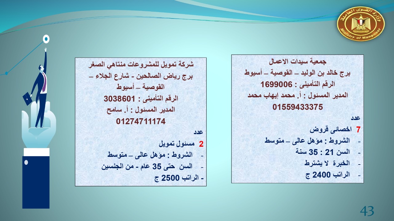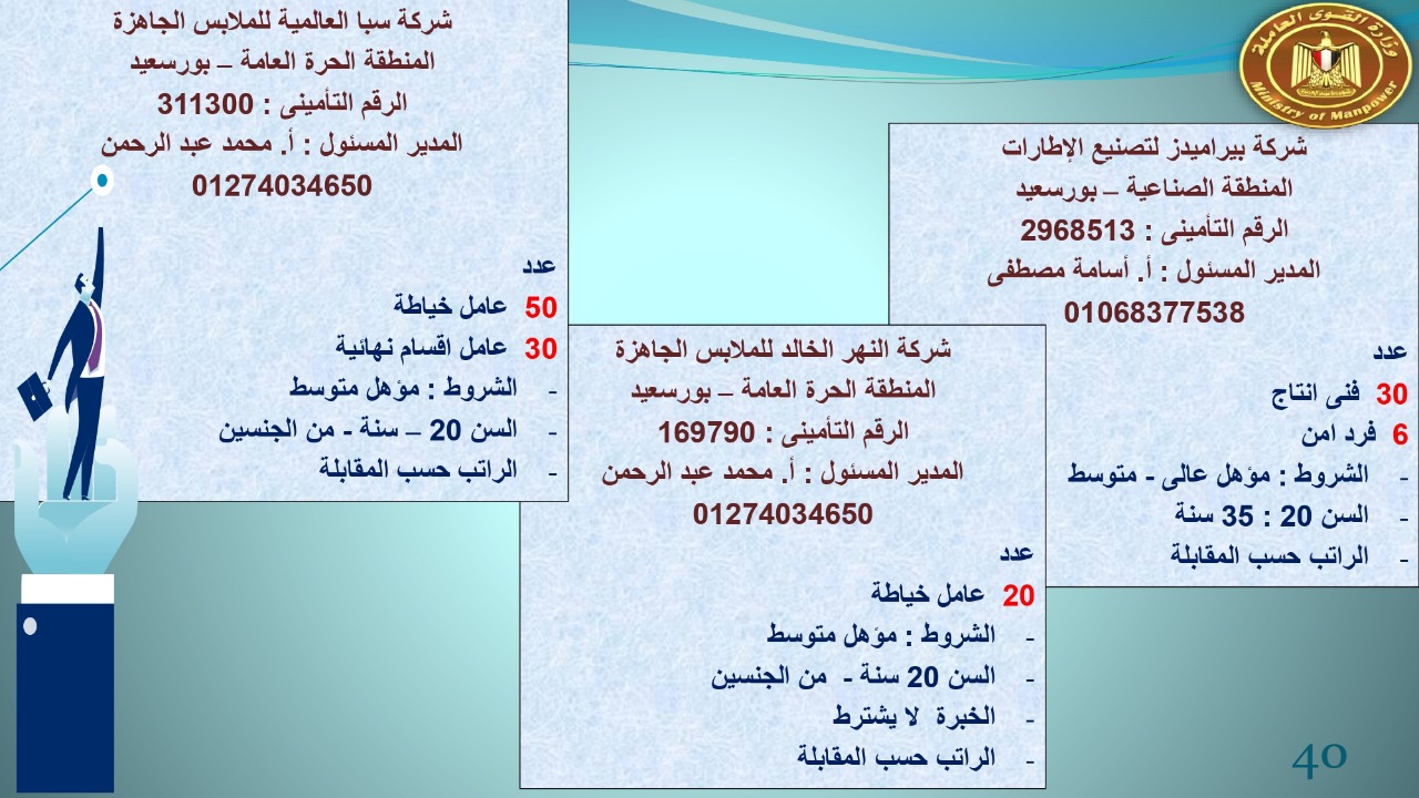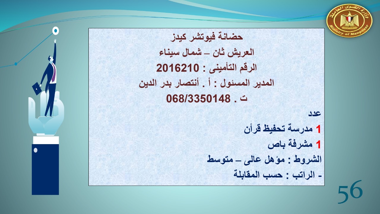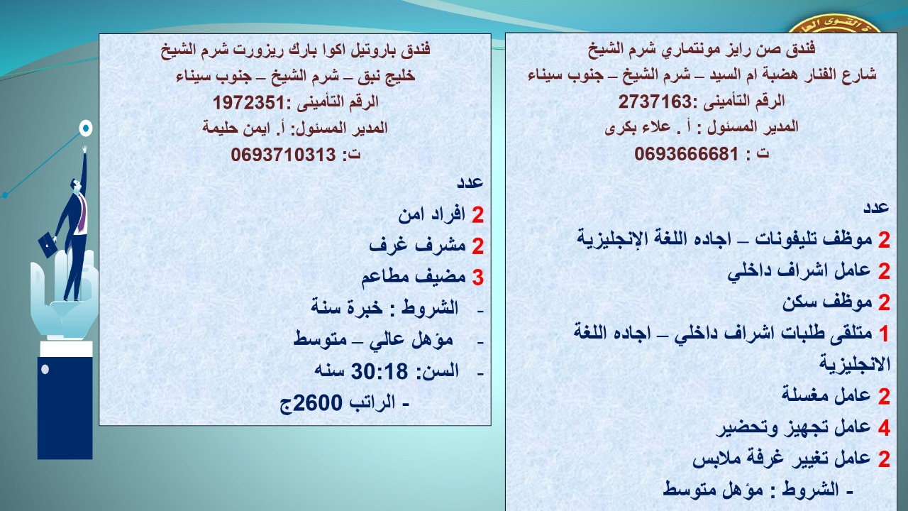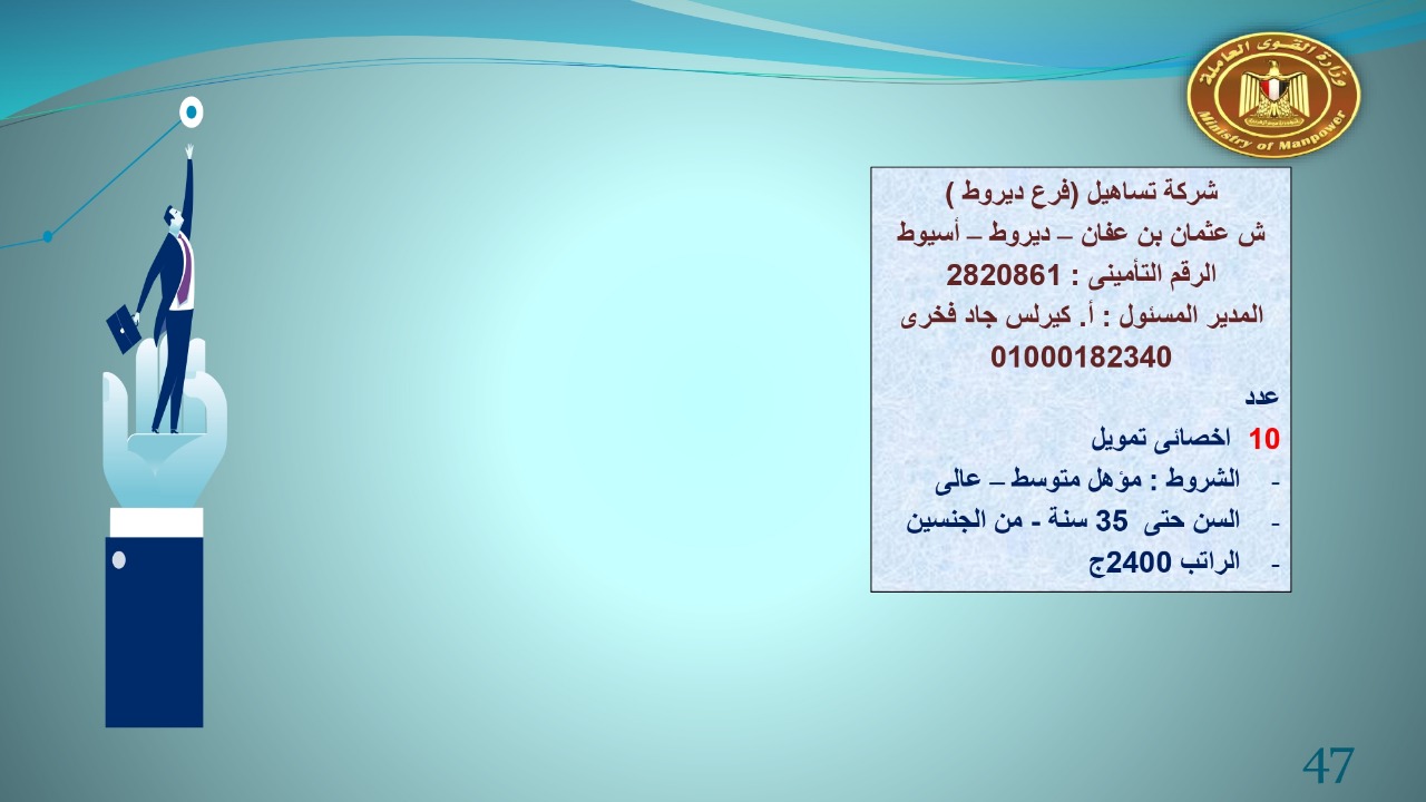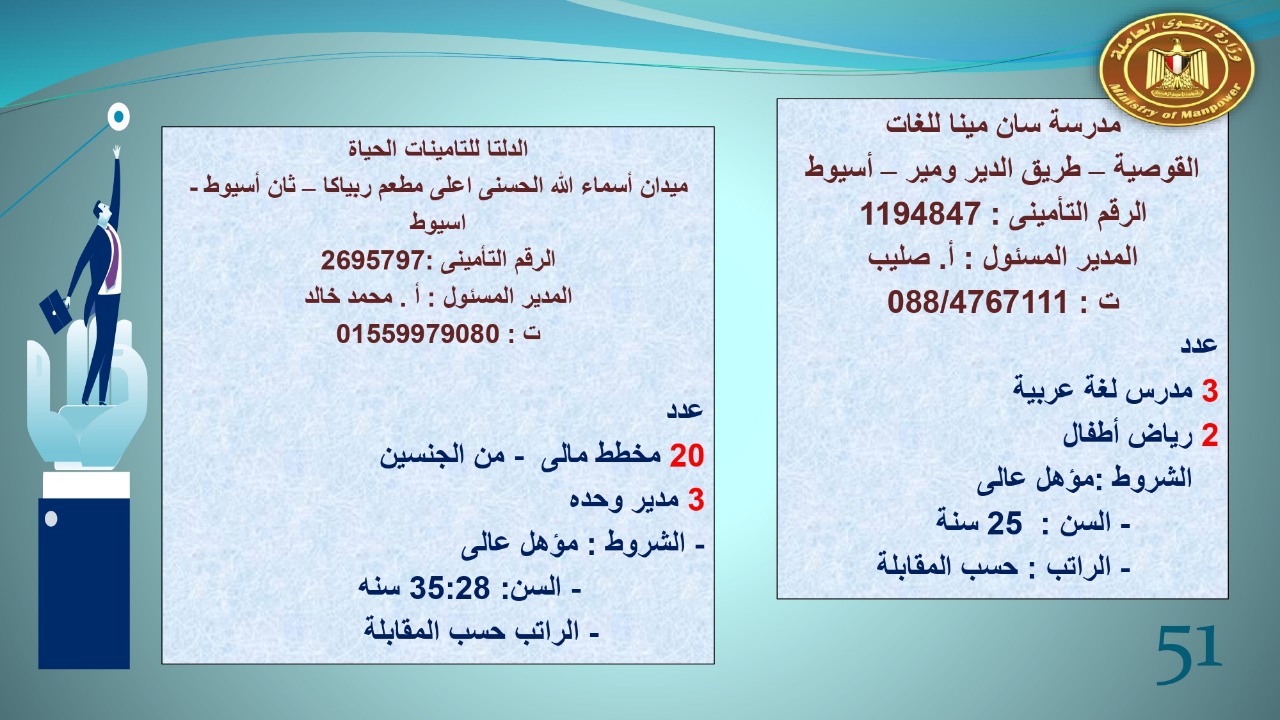 وجاء في بيان صحفي اليوم الإثنين ،أن نشرة التوظيف الدورية التي تصدر عن "الوزارة" ،تعلن عن فرص عمل جديدة ،متوفرة في 14 محافظة، هي : القاهرة ، الشرقية ، القليوبية ، الغربية ، البحيرة ، دمياط، بورسعيد ، جنوب سيناء ، الوادي الجديد، قنا، أسيوط ، شمال سيناء ، قنا ، المنوفية .. وفي التخصصات الأتية : مهندسين ، ومشرفين ، ومسئول فرع ، وبائعين ، وعمال إنتاج ، وكول سنتر ، ومندوبين مبيعات ، وسائقين ، وعمال تفصيل وحياكة بكافة تخصصاتها ، ومهن فنية ، وأفراد امن فى مواقع متميزة ، وكيميائيين ، واخصائيين تمويل وخدمات مالية ، وكافة تخصصات وظائف الفندقة ، وتخصصات أخرى .