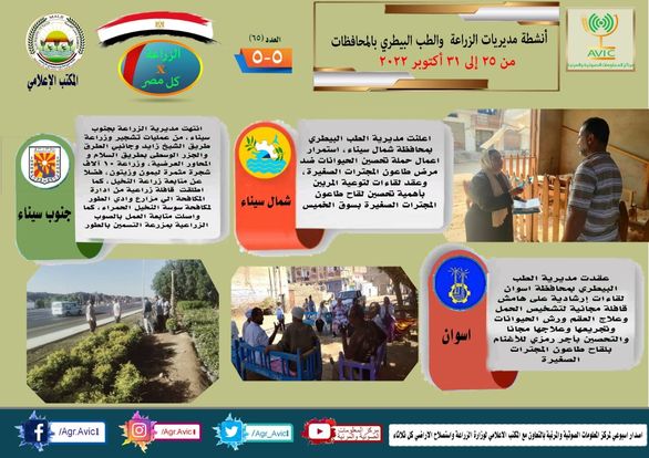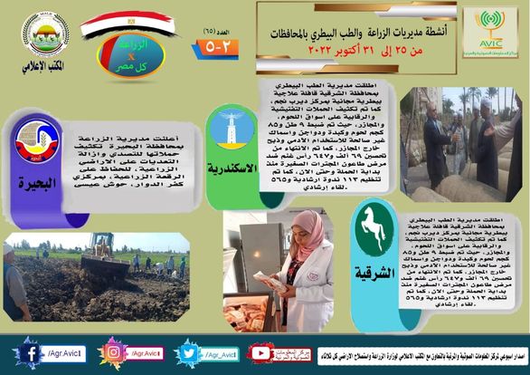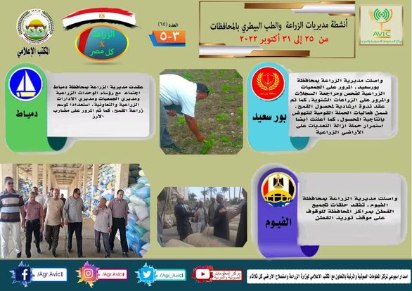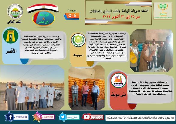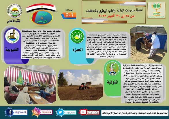 أصدر مركز المعلومات الصوتية والمرئية التابع لوزارة الزراعة واستصلاح الأراضي، والمكتب الاعلامي للوزارة، العدد رقم ٦٥ من اصدار: "الزراعة في كل مصر" بالانفوجراف والفيديو، يوضح الجهود والانشطة التي تقوم بها مديريات الزراعة والطب البيطري بمحافظات الجمهورية خلال الفترة من ٢٥ وحتى ٣١ اكتوبر الجاري.