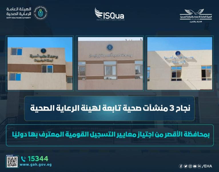 نجحت 3 وحدات طب أسرة تابعين لهيئة الرعاية الصحية بالأقصر ، وهم وحدات طب أسرة(( أرمنت الوابورات، الحلة، زرنيخ ))، في إجتياز معايير التسجيل القومية المعترف بها دوليًا.